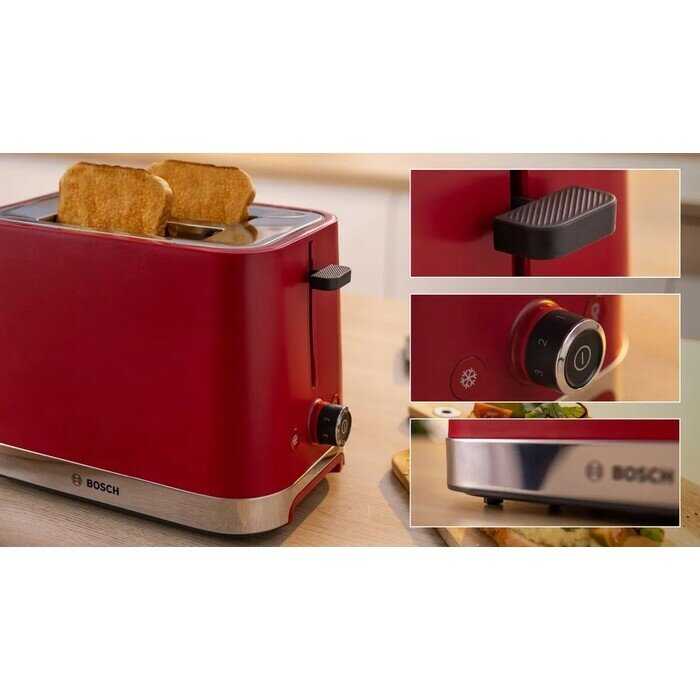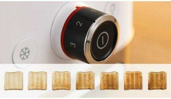 Выбирала этот тостер вместо старого Bosch. Заменила, так как морально устарел. Прослужил 8лет, надеюсь новый будет служить не меньше Поджаривает хлеб равномерно, при завершении поджаривания хлеб не вылетает. Звуковой сигнал отсутствует. Очень удобная функция подогрева булочек, пирожков. Такая же была на старом тостере. У других марок такого не встречала.