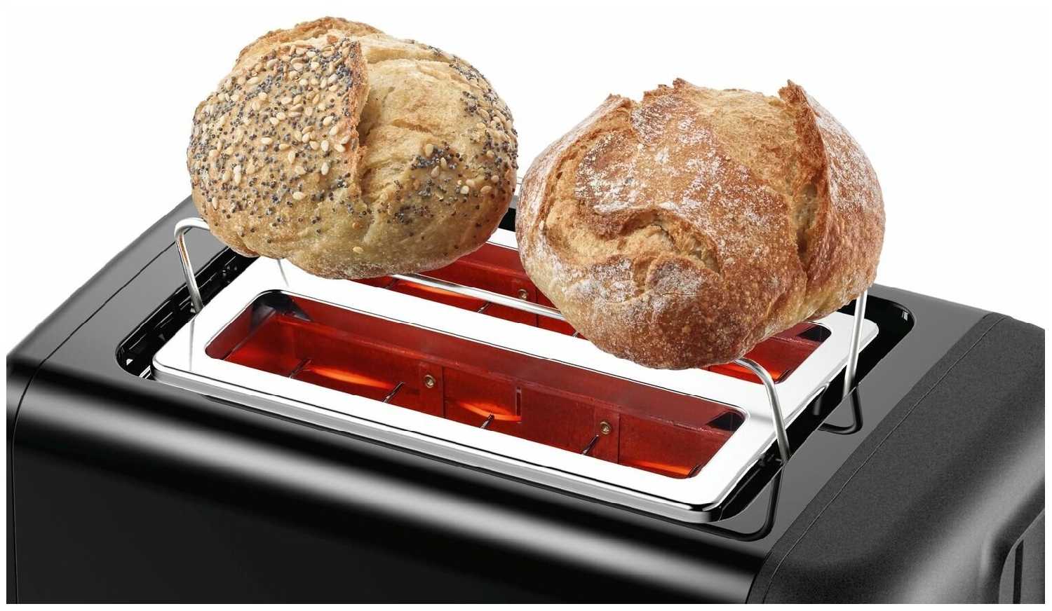 - Решетка для подогрева булочек выдвигается из корпуса, позволяя разогревать выпечку без прямого контакта с нагревательными элементами.