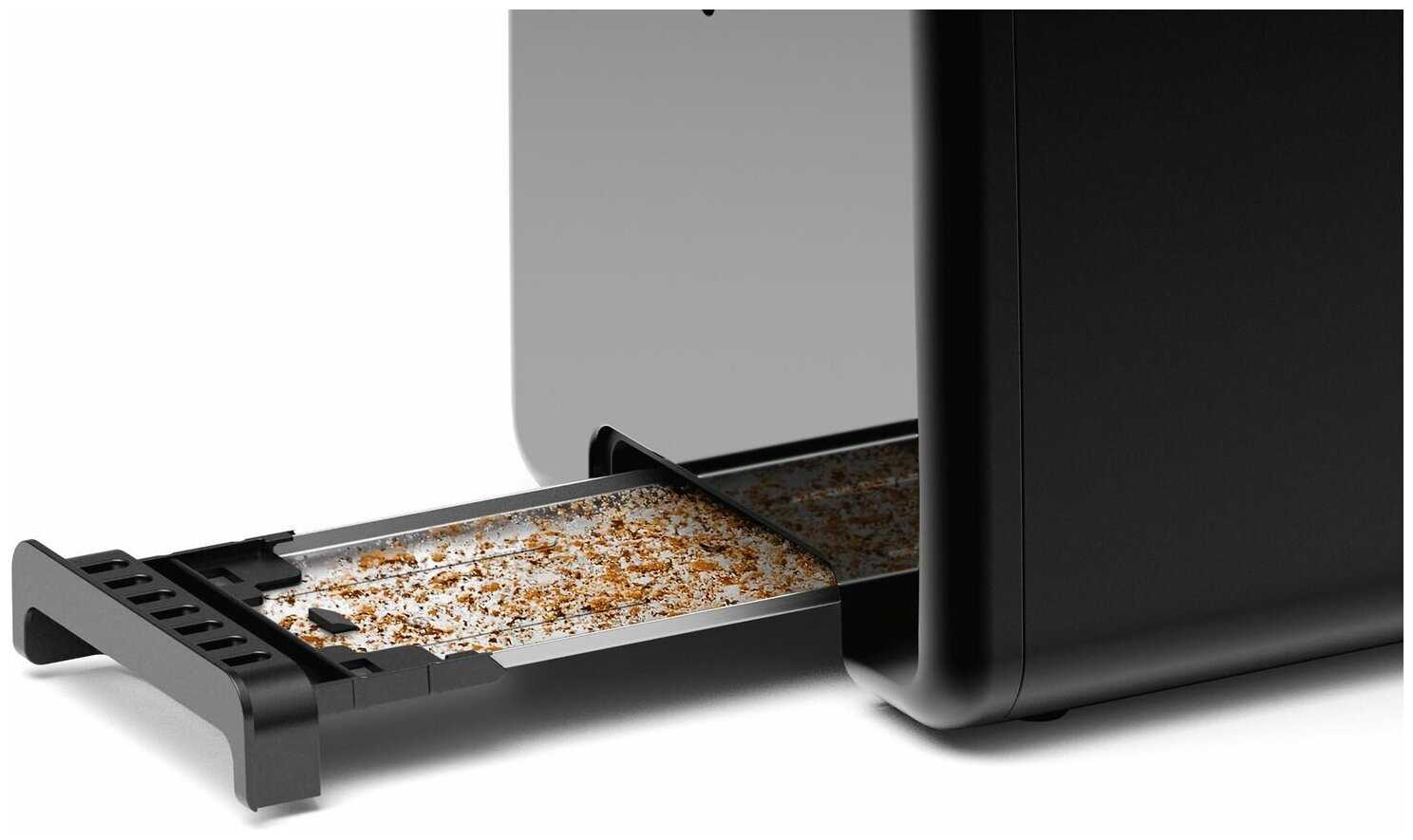- Выдвижной лоток для крошек упрощает уход, хотя часть крошек может оставаться в щелях.