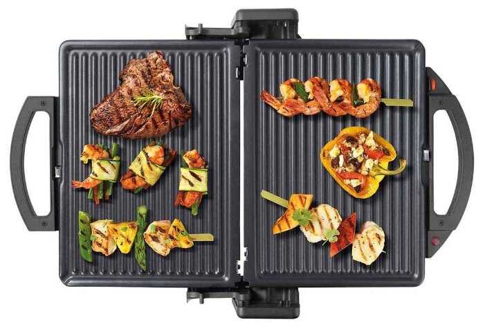 съемные пластины, быстрый и равномерный разогрев, верхняя панель приподнимается на высоту всего продукта равномерно, то есть нет такого, что сзади она прикрыта, а спереди открыта, как-то она подстраивается и продукт прожаривается одинаково со всех сторон - это пожалуй самое удобное. До этого был гриль без вот этой функции, и я даже не знала, что это так удобно и нужно для равномерного прожаривания продукта.. Вертикальное хранение.