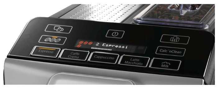 - Сенсорный экран с интуитивными пиктограммами упрощает выбор напитков (эспрессо, латте макиато, кофе крема).