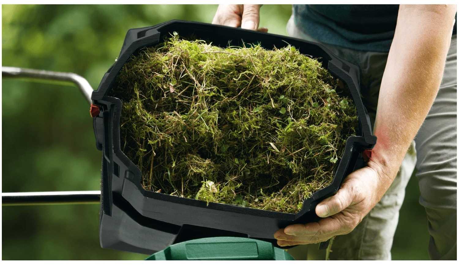 - Быстросъёмный травосборник из ударопрочного пластика удобен для очистки и не впитывает влагу.