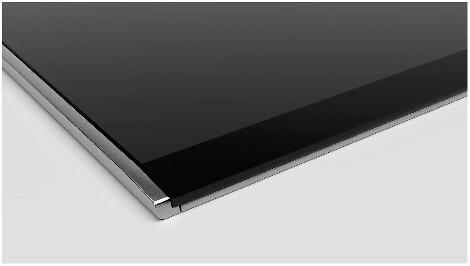 - Тонкая рамка из нержавеющей стали защищает края стеклокерамики от сколов, сохраняя эстетику «безрамочного» дизайна.