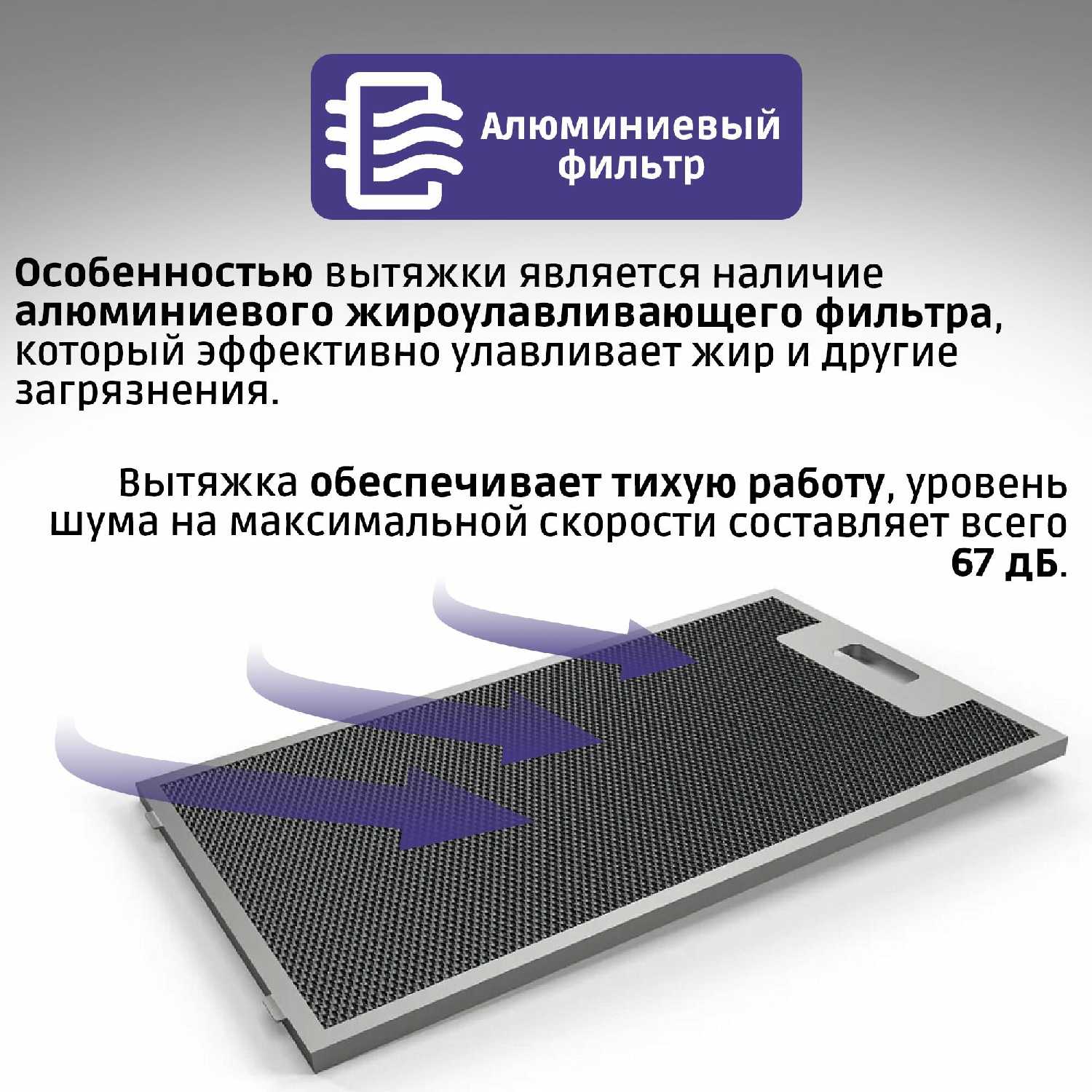 Алюминиевый жироулавливающий фильтр имеет увеличенную площадь (37×49 см), эффективно задерживая частицы жира. По отзывам, при регулярной готовке его достаточно промывать раз в 2-3 недели. Угольный фильтр для рециркуляции не предусмотрен конструкцией – это минус для помещений без вывода в вентиляцию. -