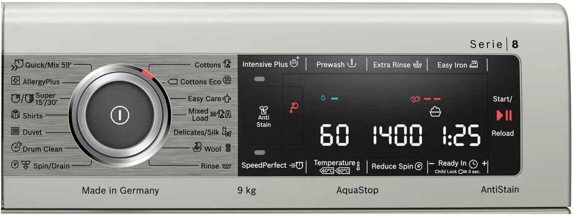 - максимальная загрузка белья: 9–9