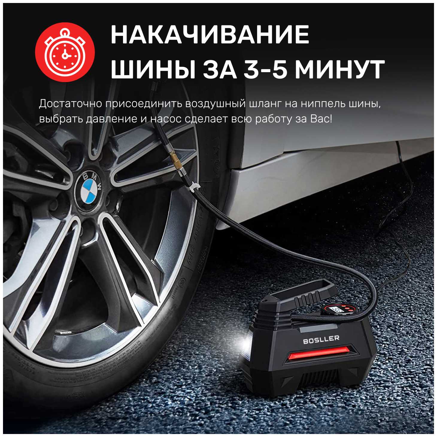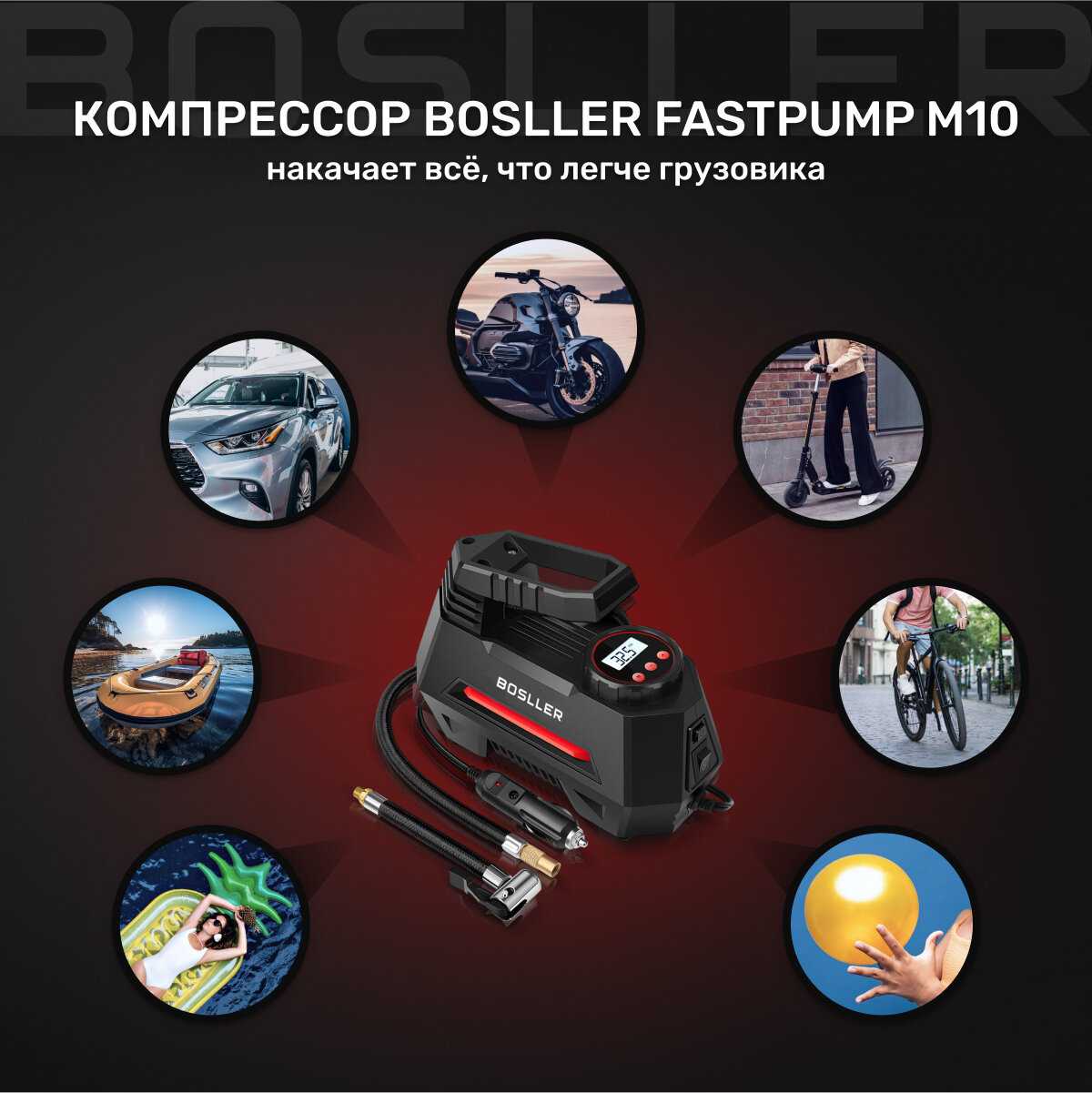 Приобрела компрессор в подаоюрок мужу по совету, уж очень советовали BOSLLER. Пользуется уже почти год. С подкачкой шин справляется на отлично. Удобен в обращении, справится любой, хорошо просматривается дисплей, крупные цифры. Есть несколько дополнительных насадок, что очень удобно, можно накачать и мяч и лодку и т.д. Компрессор стоит своих денег, советую, муж доволен.