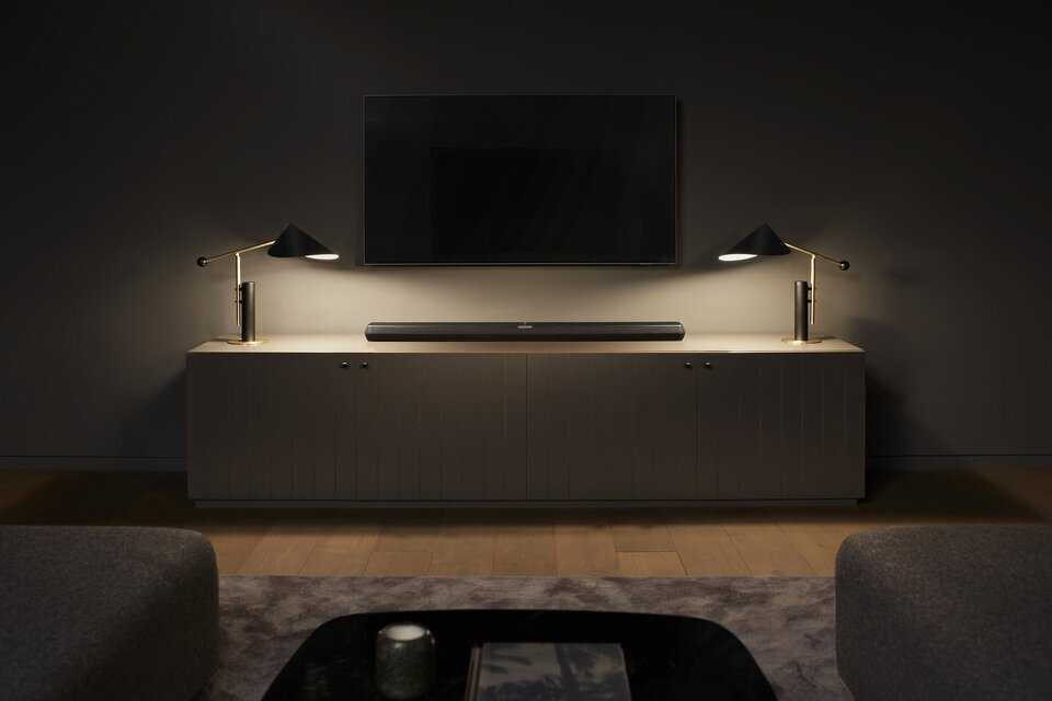 - + Отличный звук. Очень естественный, не пережатые басы. Что характерно бренду, за это его очень люблю. Если найдете качественный контент Dolby Atmos, то очень хорошо погружает в звуковое поле. Звук сверху, сзади отлично распознается. Качественный контент в стерео - так же на ура. На 30% громкости в гостиной 30м - более чем хватает. Больше не пробовал - соседей жалко.