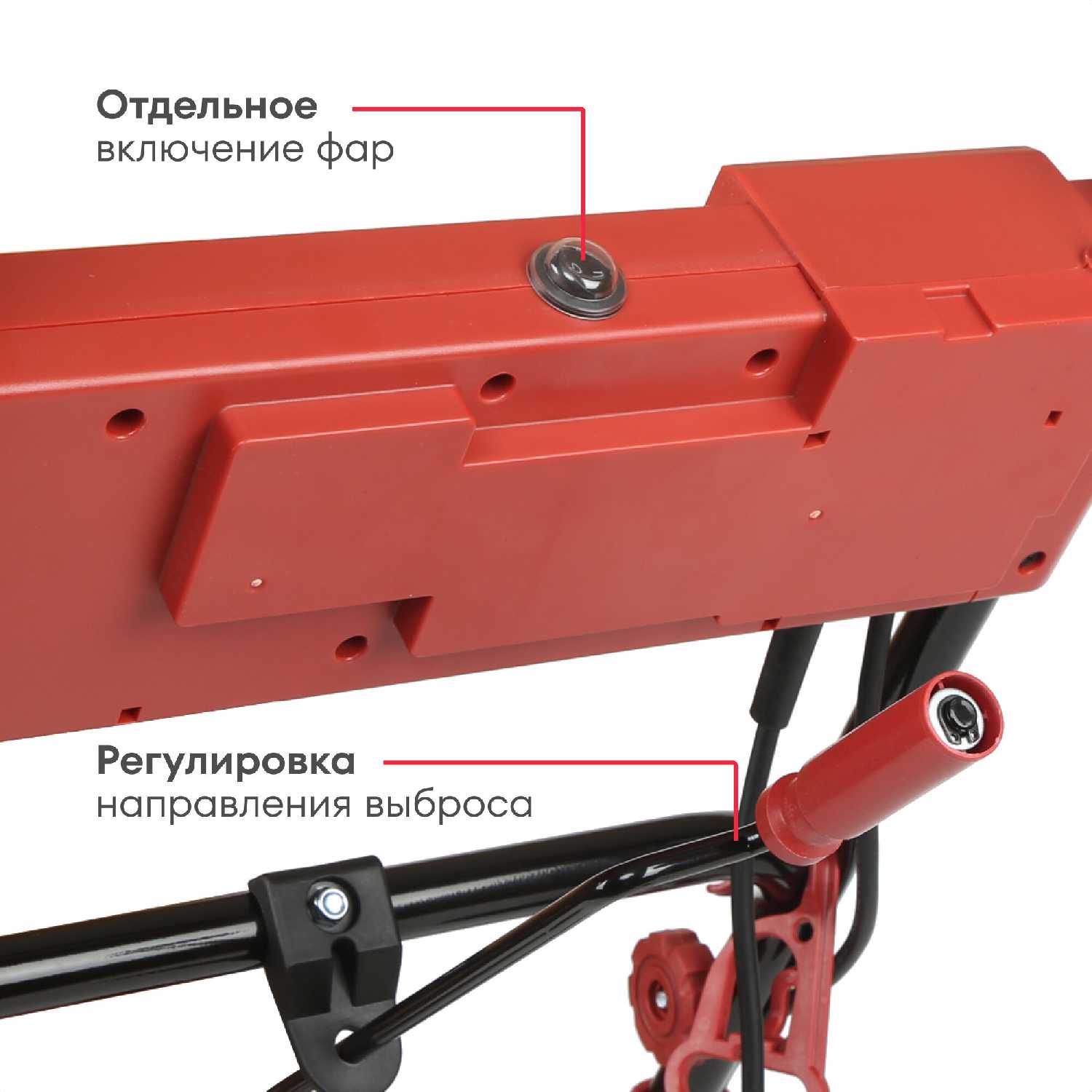 При весе около 20 кг аппарат легко маневрирует на ровных поверхностях, но малый диаметр колёс затрудняет движение по глубокому снегу. Многие пользователи самостоятельно заменяют колёса на лыжи от трюкового самоката – это улучшает проходимость и снижает усилие при толкании на 40%. Ручка регулировки угла выброса признана неудобной: фиксатор часто самопроизвольно ослабляется, направляющий желоб сбрасывает настройки при вибрации, а ограниченный диапазон наклона не позволяет сформировать компактные валы снега вдоль дорожек. Подсветка рабочей зоны получила единодушное одобрение – фары обеспечивают видимость при ночной уборке, полностью заменяя стационарное освещение.