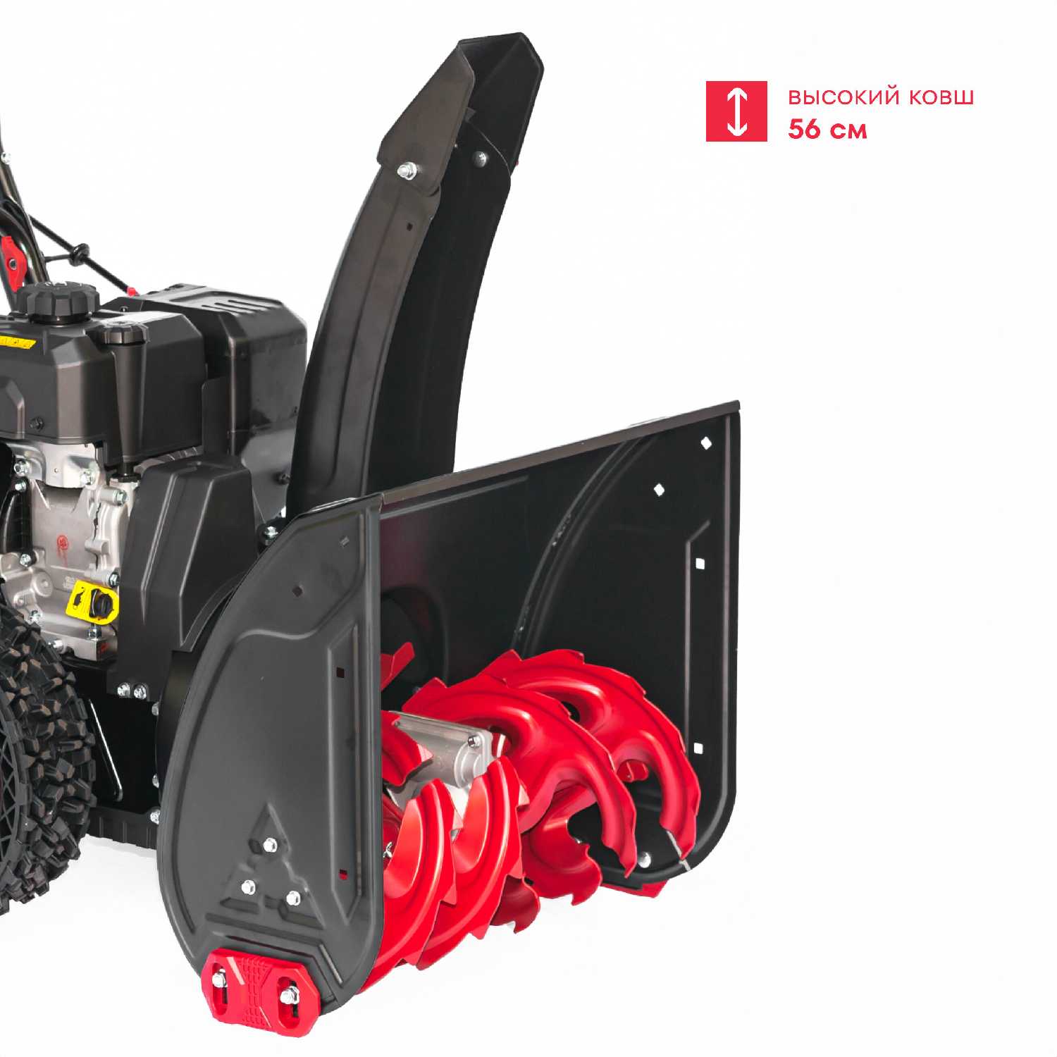 - Желоб с регулируемым углом (до 210°) и металлическим усилителем краев обеспечивает стабильный выброс даже мокрого снега.