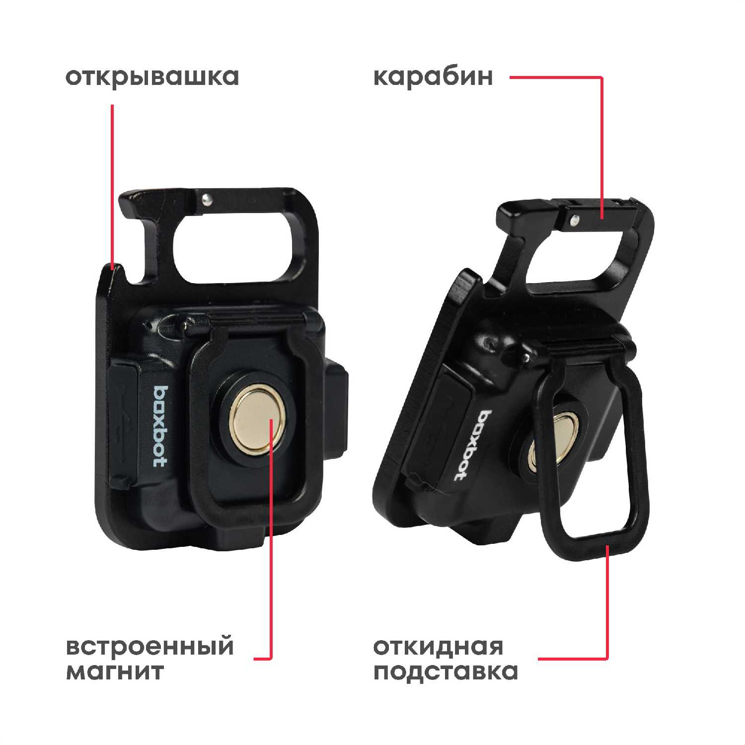 Помимо магнитного крепления, фонарь оснащен металлическим карабином для подвешивания на рюкзаки, сумки или ключи. Поворотная пластиковая петля служит подставкой для установки на горизонтальные поверхности с регулируемым углом наклона. Дополнительно в корпусе имеется резьба 1/4 дюйма для установки на штативы или другие совместимые крепления. -