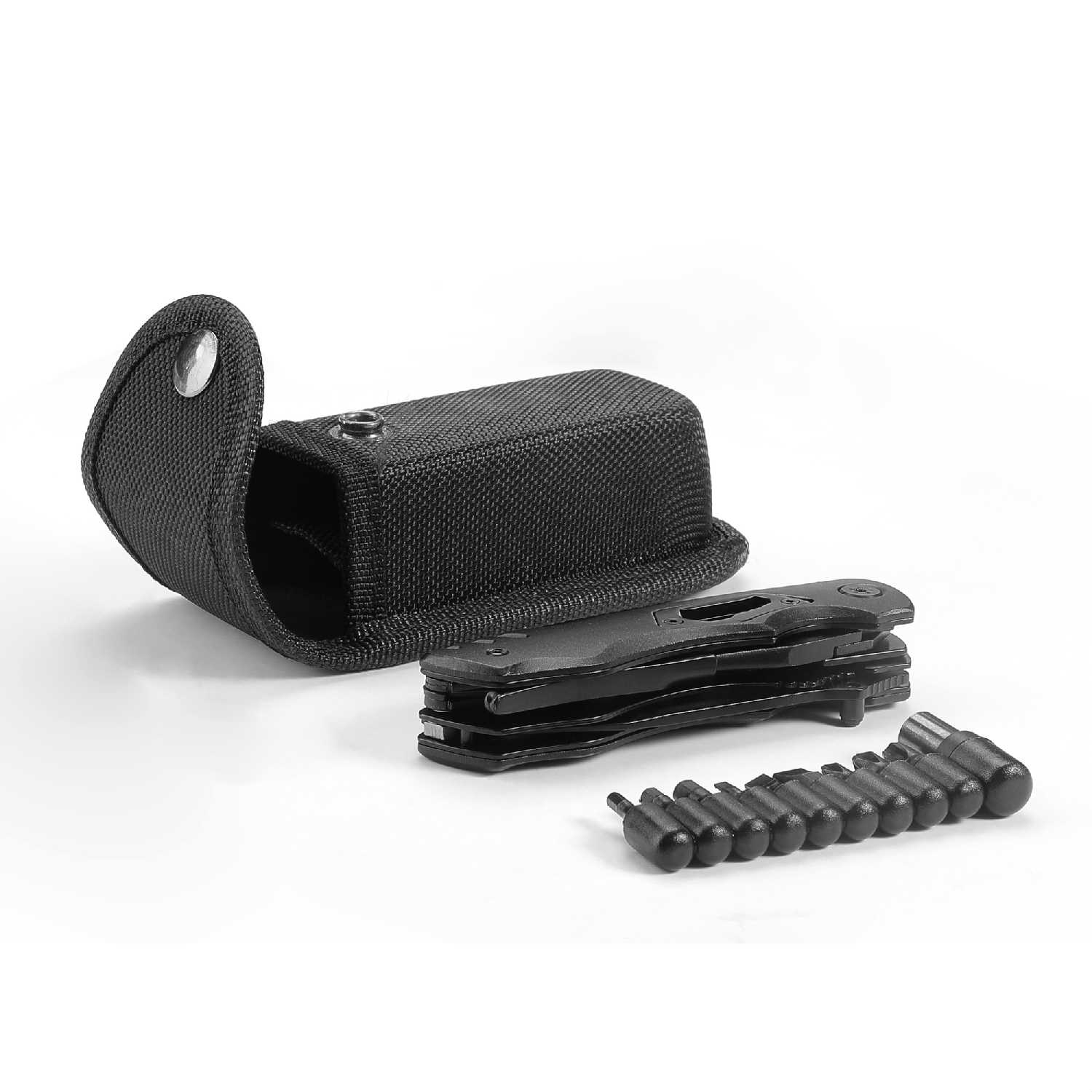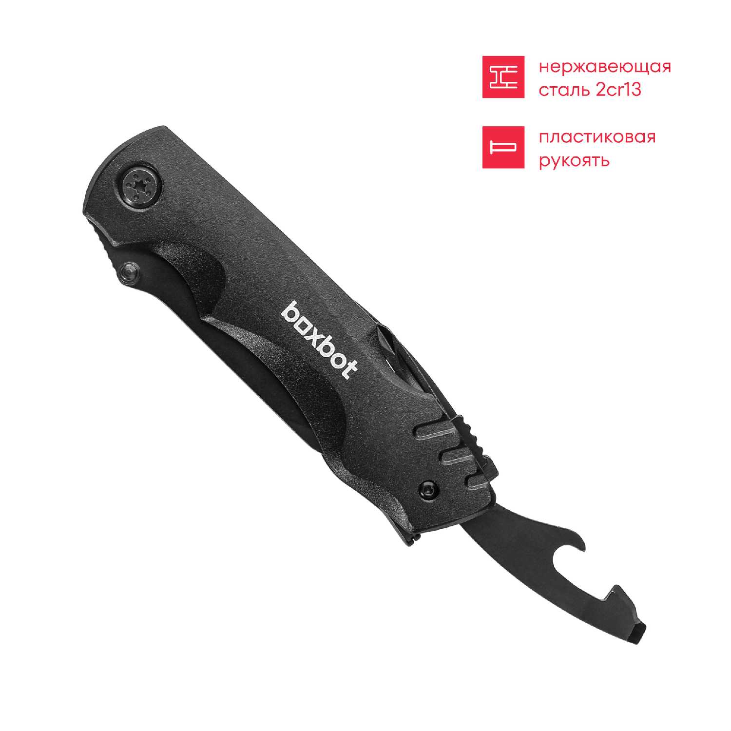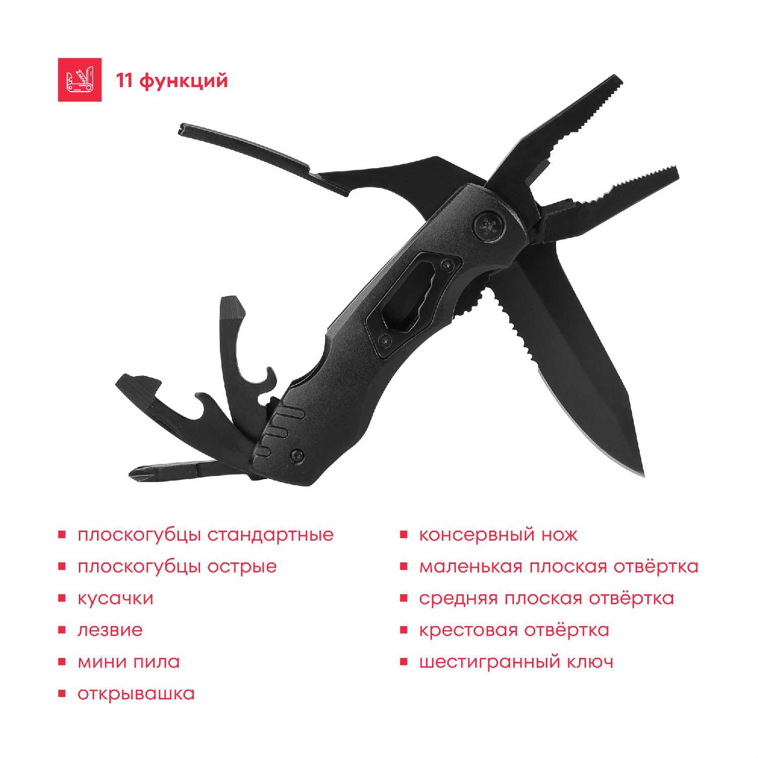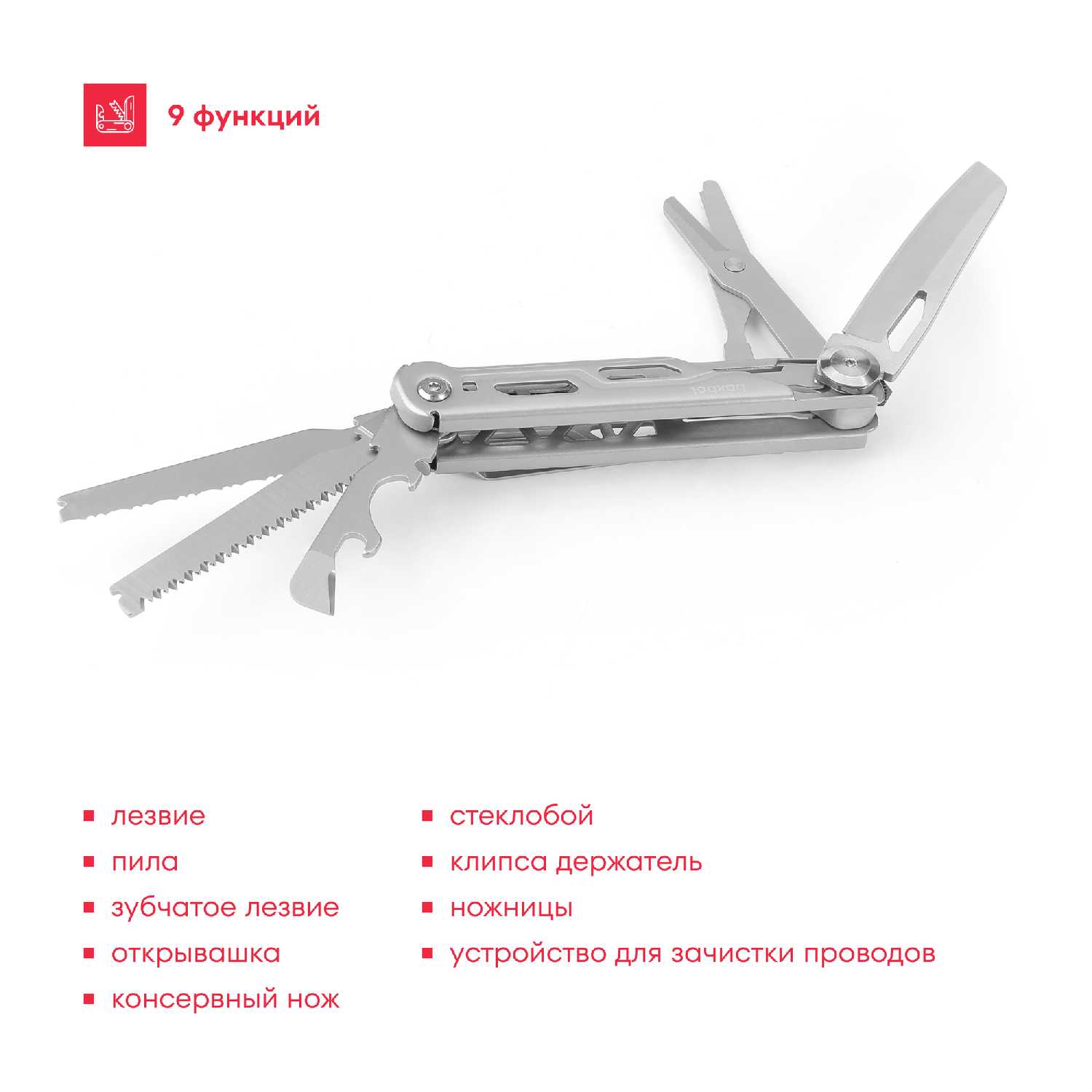 Инструменты (функции) : | консервный нож, открывалка для бутылок, пила, сменные биты, нож, кусачки, инбусовый ключ, ножницы, отвертка, стеклобой, плоскогубцы, клипса |