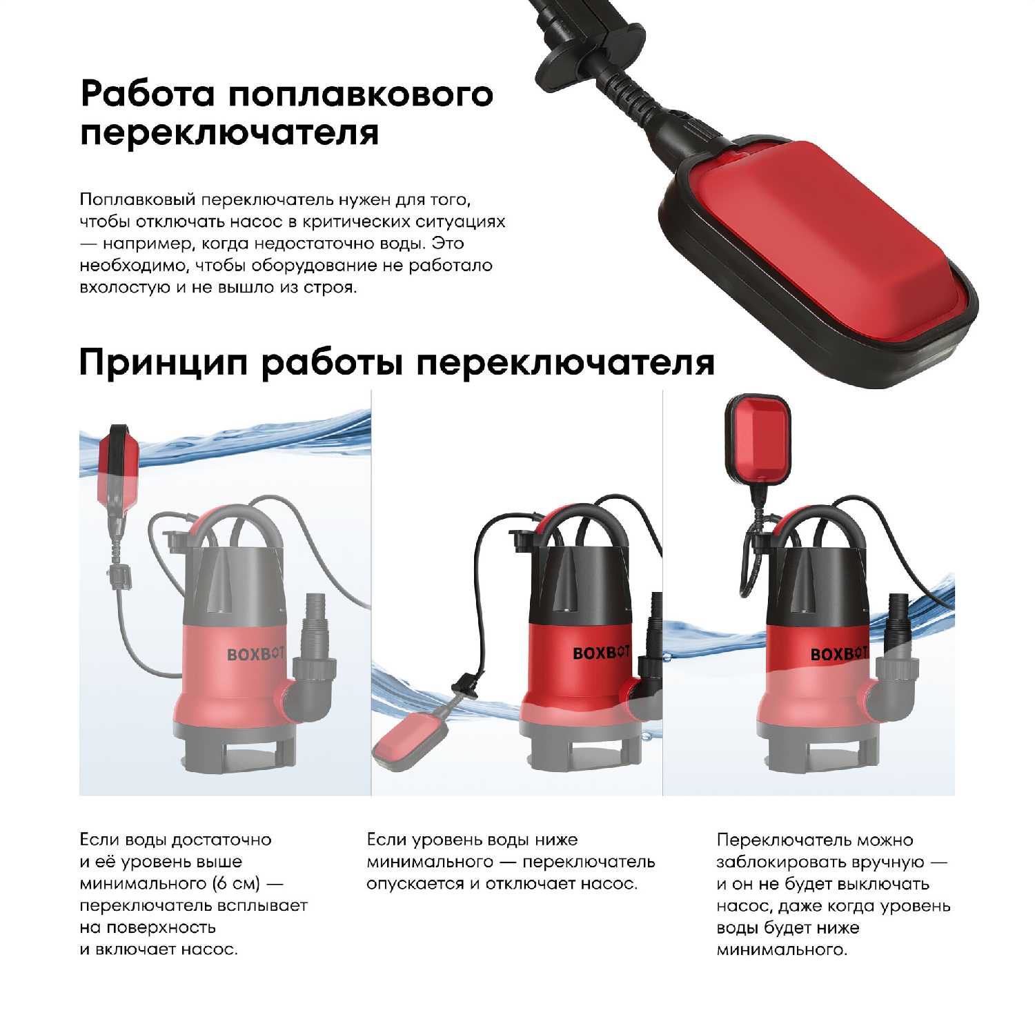 Кратковременный «сухой ход» не выводит насос из строя (отмечено в тестах), но систематическая работа без воды опасна. Поплавковый выключатель снижает риски, но при его ручном отключении или нештатных ситуациях возможен перегрев и поломка двигателя. -
