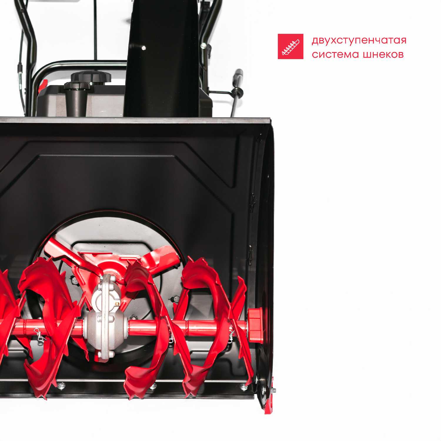 - Желоб с регулируемым углом (до 210°) и металлическим усилителем краев обеспечивает стабильный выброс даже мокрого снега.