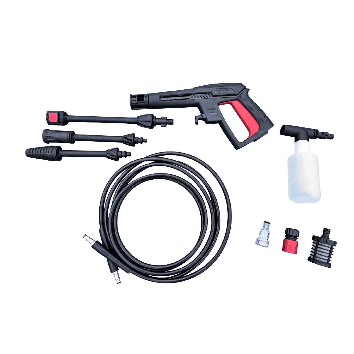 | Подробная комплектация : | 1. Мойка высокого давления 2. Пистолет высоконапорный (в разборе - рукоять, трубка, насадка распылительная с регулировкой угла струи) - 1 шт. 3. Шланг 5 м - 1 шт 4. Коннектор для шланга на вход - 1шт 5. Штуцер с фильтром для шланга на вход - 1шт 6. Фильтр входной для всасывания для шланга - 1 шт 7. Емкость для моющего средства - 1 шт 8. Насадка распылитель "турбо" (грязевая фреза) - 1 шт 9. Руководство по эксплуатации - 1 шт |