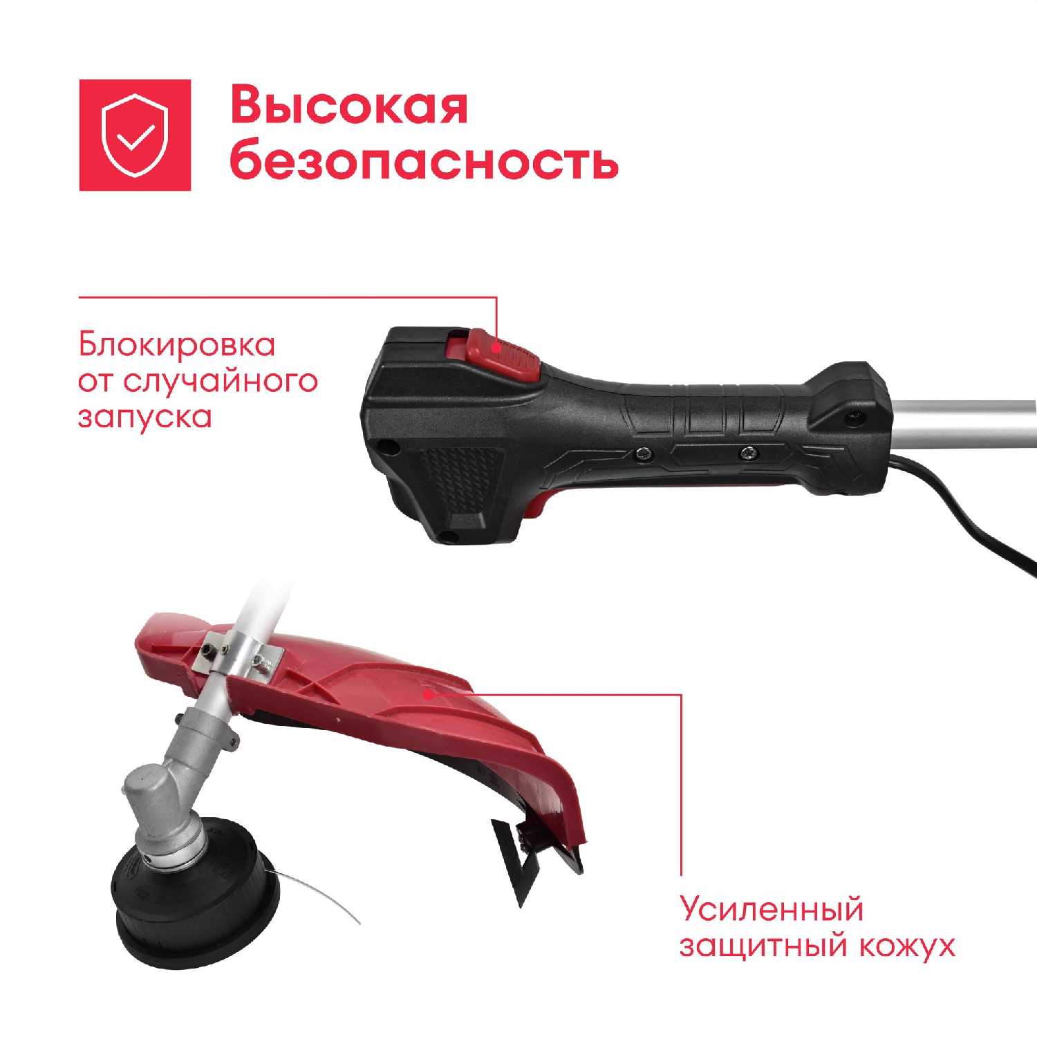 - + Мощная, большая удобная кнопка включения. Отлично режет траву, большая площадь кошения. Если вы любите косить, то эта косилка не для вас. И если вы думали, что купили электронному, то ошибаетесь, это демон. Раньше была коса около 600 Вт, и в деревне это мучение. Эта справляется на изи. Добавлять леску не сложно. Использую квадрат 2,4. По весу нормальная. И нужно под себя все настроить. Пластик защиты мягкий, что хорошо. Отличная коса.