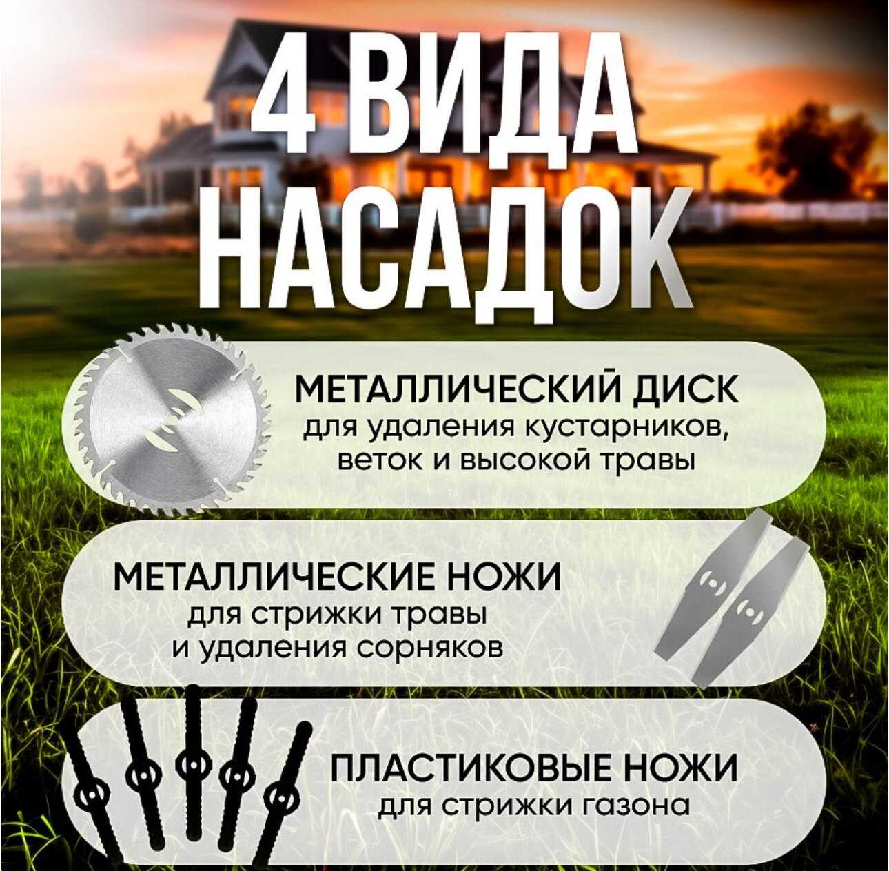 - В комплекте 4 металлических ножа, пильный диск, пластиковые ножи и леска, что позволяет выбирать оснастку под тип растительности.