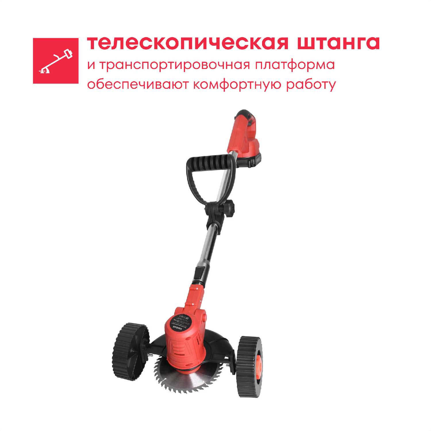 - + Работает отлично, удобно подкашивать траву возле забора, кустов. Есть колеса - руки не устают, 2 аккумулятора в комплекте, совместимы с шуруповертом 12В этой марки.
