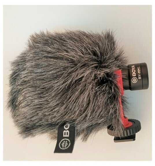 - В комплекте идет мохнатый ветровой фильтр («кошка»), который эффективно подавляет шумы от слабого и среднего ветра.