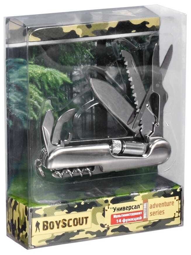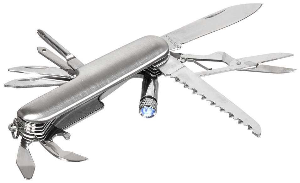 | Инструменты (функции) : | консервный нож, нож, ножницы, отвертка, открывалка для бутылок, пила, пилка для ногтей, фонарь, шило / кернер, штопор |