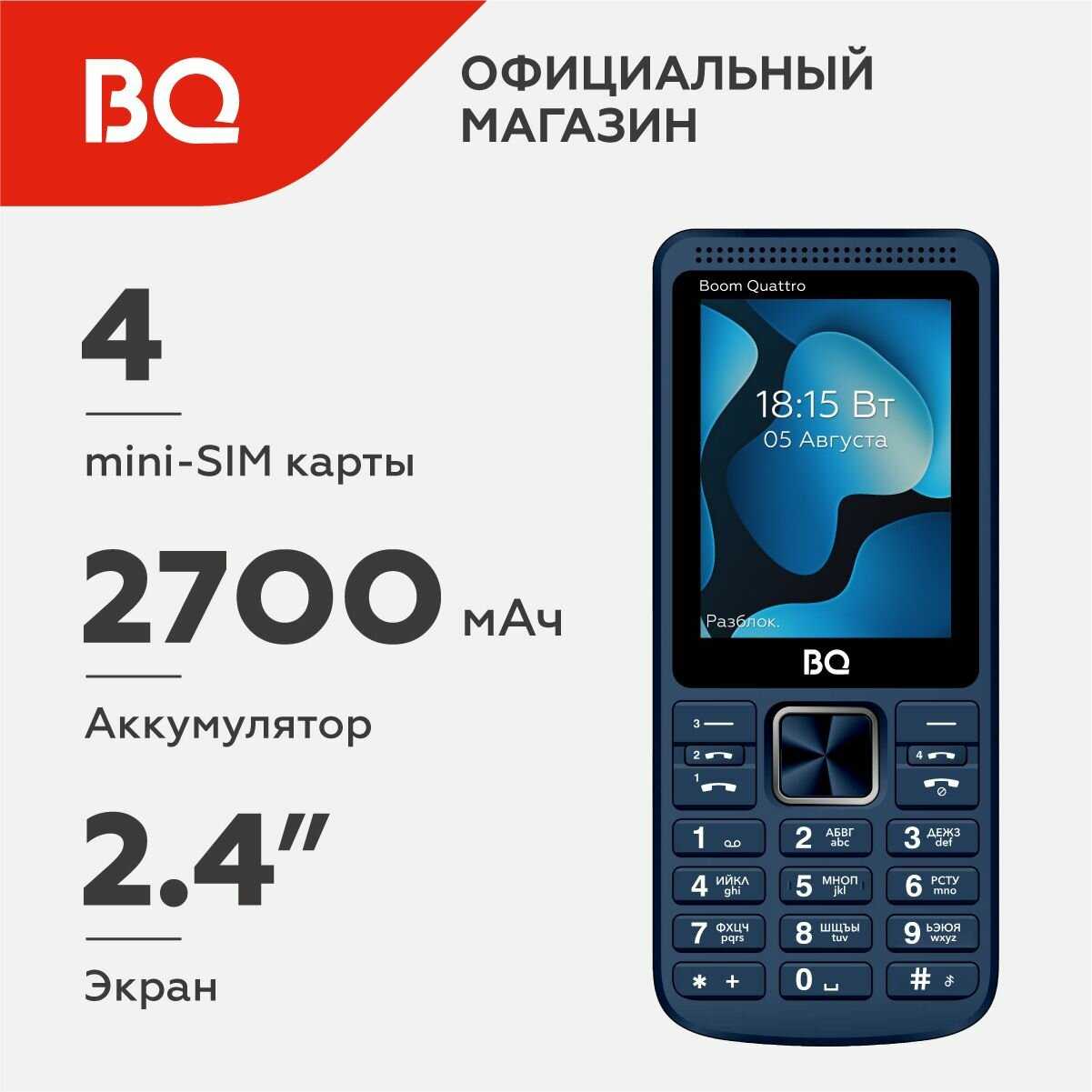- + экран неплохой, кнопки удобные как и у всех bq, 4 симки, понятное меню, мощный фонарь.