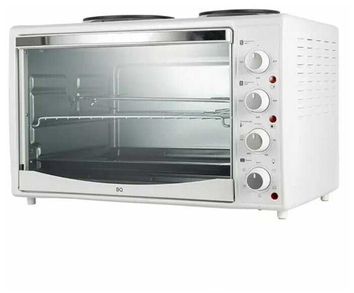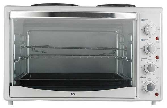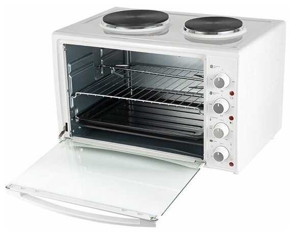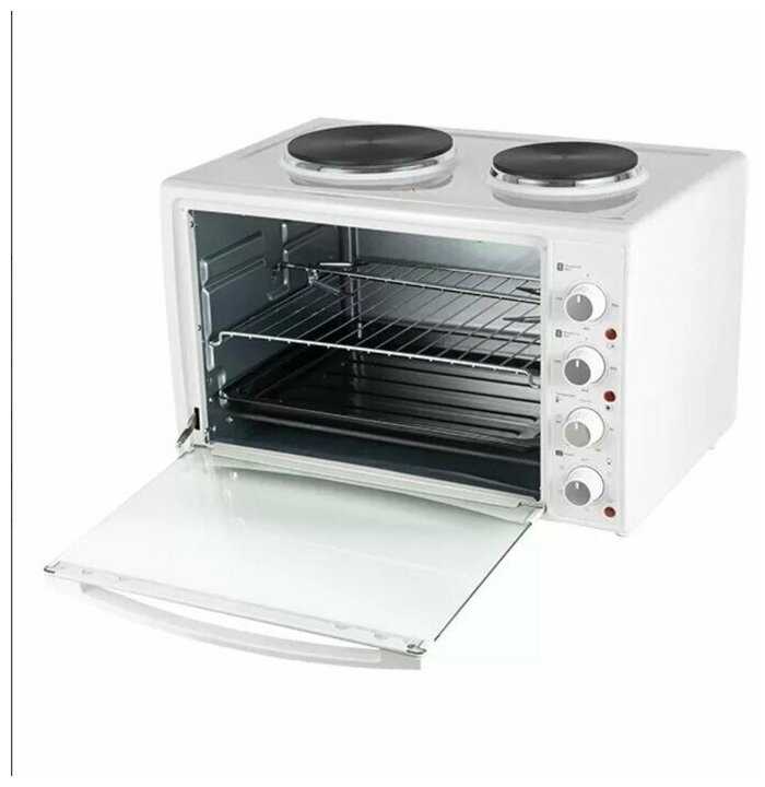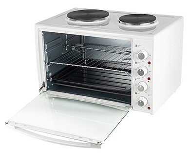 Покупал в качестве основного прибора для готовки. Размер оказался куда больше чем казалось на фото, она примерно в два раза больше микроволновки. На первых парах был запах при работе конфорок, проходит через 3-5 включений. Духовка работает отчлично: разогревается быстро, пропекает равномерно, мощности хватает на всё. А вот конфорки немного разочаровали, особенно большая. Температура нагрева на максимальной мощности недостаточна для хорошей прожарки мяса, приходится долго ждать. Если по рецепту нужно что то обжарить на сильном огне, то у вас это сделать не получится. В целом, если готовить не часто, например на даче или у вас ограничено пространство на кухне, то терпимо. Но если вы готовите часто и рассматриваете эту духовку в качестве основного инструмента, то лучше купите духовку без конфорок и отдельно электросковороду или плитку