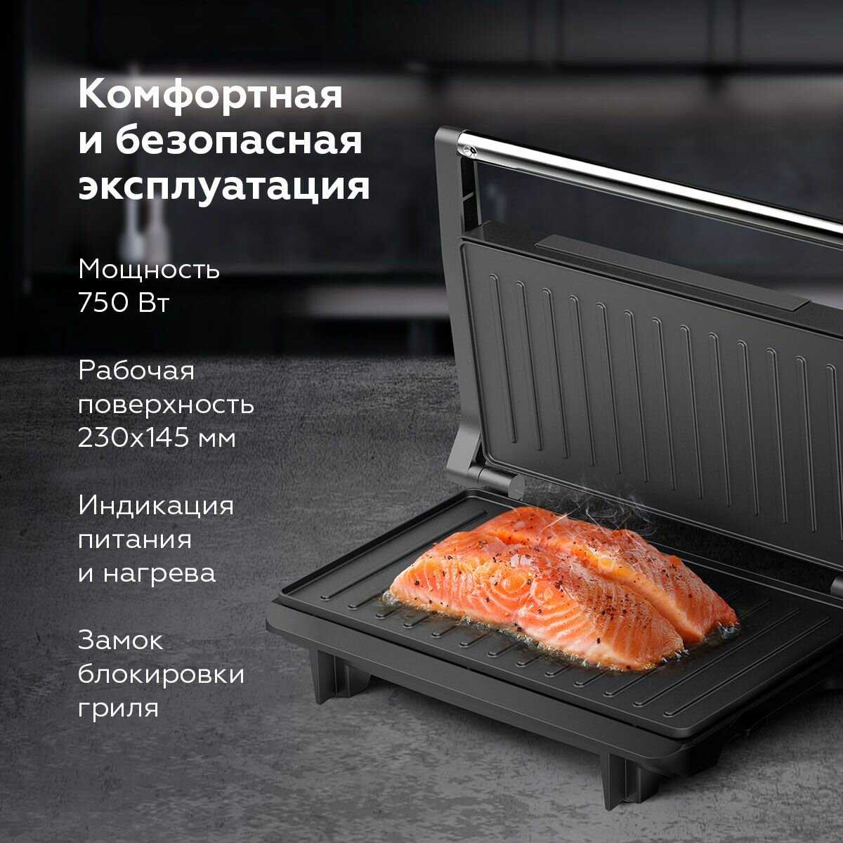 Подходит для приготовления мяса, рыбы, овощей и бутербродов. Обеспечивает качественную прожарку продуктов с двух сторон. За счёт антипригарного покрытия легко очищается и требует минимального количества масла. Небольшой размер, поэтому удобно хранить. Понятное управление и удобная настройка температуры.
