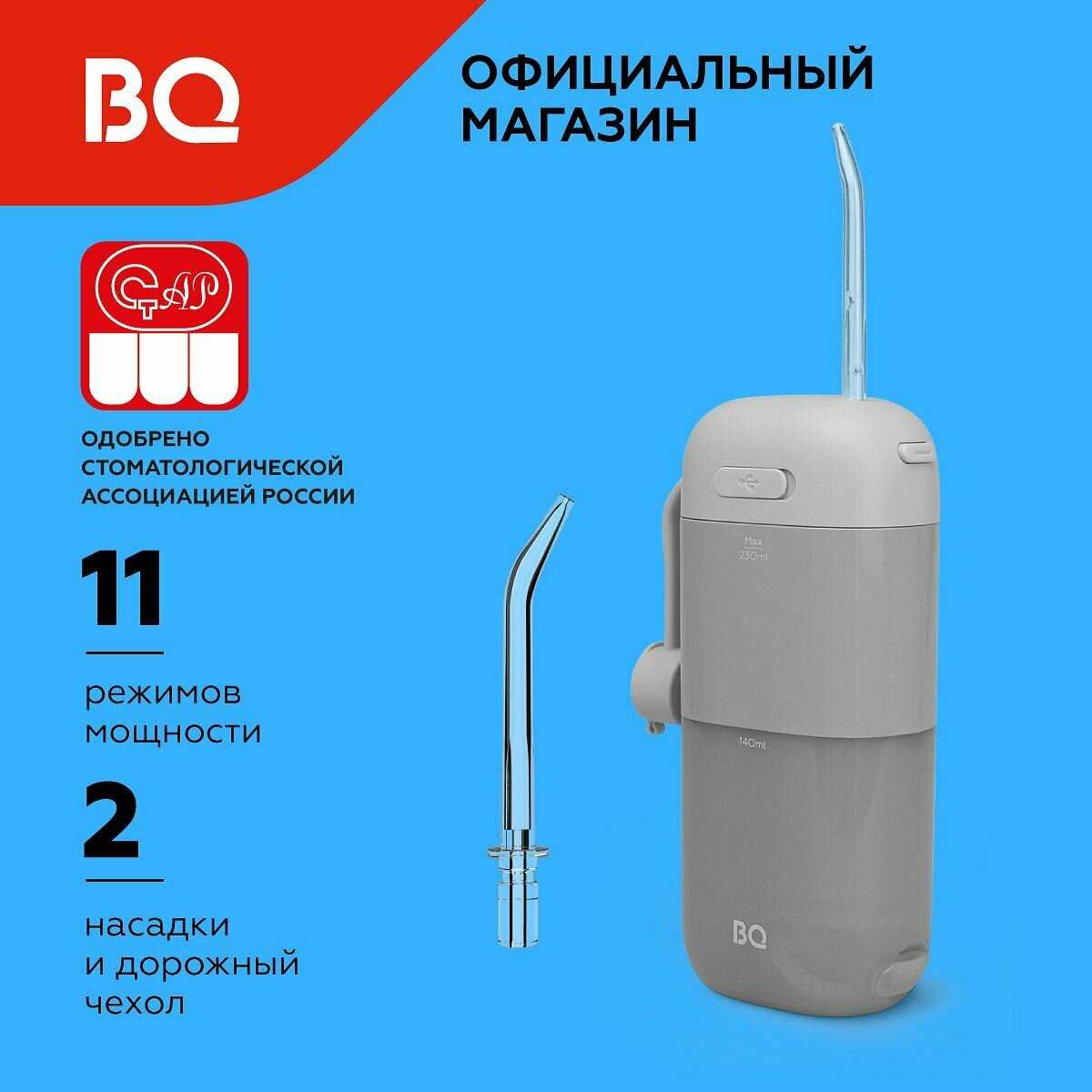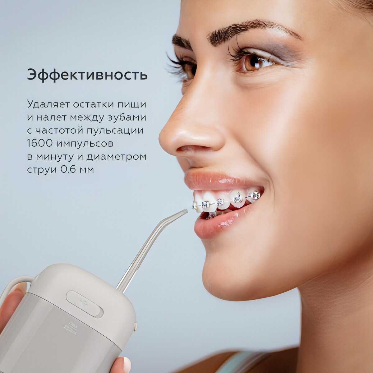 - + Компактный, удобно брать с собой. Напор достаточный чтобы почистить брекеты после еды, нужно полторы заправки водой. В комплекте еще одна обычная насадка и мешочек.