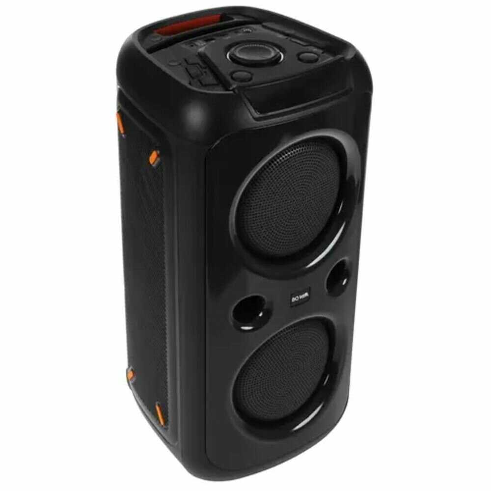 Все управление на верхней панели, кнопки с подсветкой, даже в сумерках отлично видно. Громкости хватает даже на большую компанию, человек 10-15, проверено. Когда садится аккумулятор, подключаем к автомобильному через инвертор.