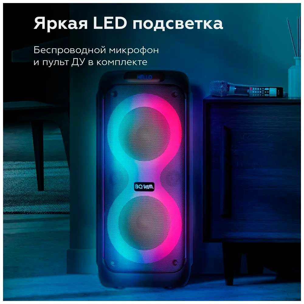 - + Эта аудиосистема оказалась довольно универсальной в использовании. Мы с семьей поем под нее, как под караоке, сын подключает гитару и играет через нее в роли усилителя, а еще просто наслаждаемся музыкой. Звук выходит мощным и четким, без лишних шумов. Порадовала стильная подсветка, которая добавляет атмосферы.