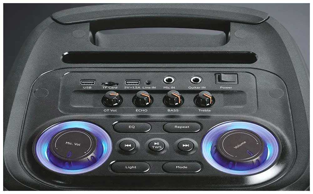 достаточно мощная. Мы поехали загород и взяли ее с собой. Вечером пели караоке. Удобно, что пультом можно и переключать песни, и звук регулировать…Все устали, напелись, а заряд аккумулятора еще остался :))
