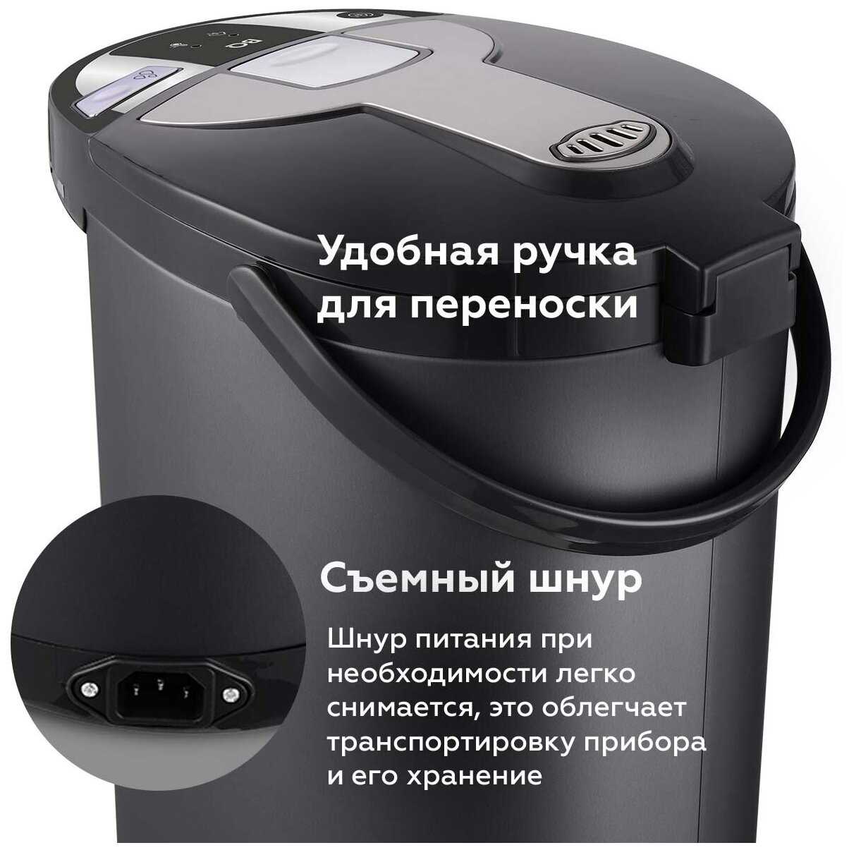 - Удобно добавлять холодную воду по мере использования, прибор автоматически кипятит и поддерживает тепло.