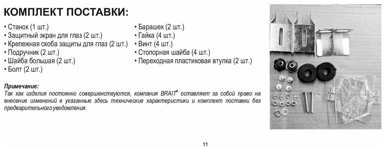Подробная комплектация : | - Станок (1 шт.) • Защитный экран для глаз (2 шт.) • Крепежная скоба защиты для глаз (2 шт.) • Подручник (2 шт.) • Шайба большая (2 шт.) • Болт (2 шт.) • Барашек (2 шт.) • Гайка (4 шт.) • Винт (4 шт.) • Стопорная шайба (4 шт.) • Переходная пластиковая втулка (2 шт.) |