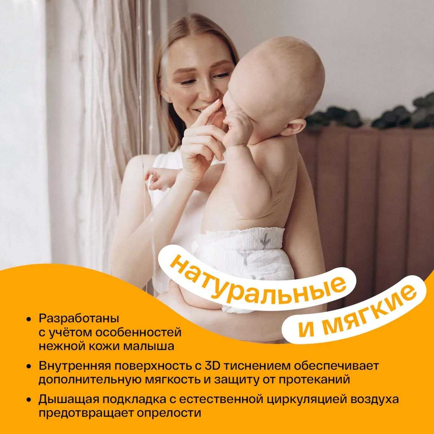 - + Натуральные, гипоаллергенные, хорошо впитывают влагу, не протекают (видел отдельные комментарии о протечке, это явно вина родителя, либо неправильно надели подгузник, либо редко меняют его). Отличный бренд, всем рекомендую