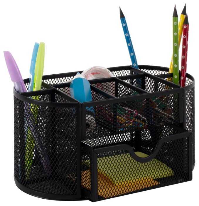 - + Вместительный и стильный, количество и объëмы ячеек под разного рода канцелярские предметы устраивают.