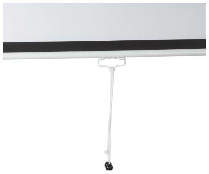 Хороший и качественный экран. По краю белого полотна идет черная окантовка, которая должна улучшать восприятие. Мне не с чем сравнить, но могу сказать, что она абсолютно не мешает, но цвета на ее фоне выглядят более контрастными. Основание крепкой, легко фиксируется. Можно повесить на стену или докупить крючки для потолка. Сворачивается и разворачивается за счет пружины. В принципе экран в развернутом виде держится отлично, сам по себе не норовит свернутся. Полотно идеально белого цвета. Не замечено наличие искажений. Цвета получаются более яркими, чем при проекции на стену или белую ткань. В свернутом виде на стене не заметен.