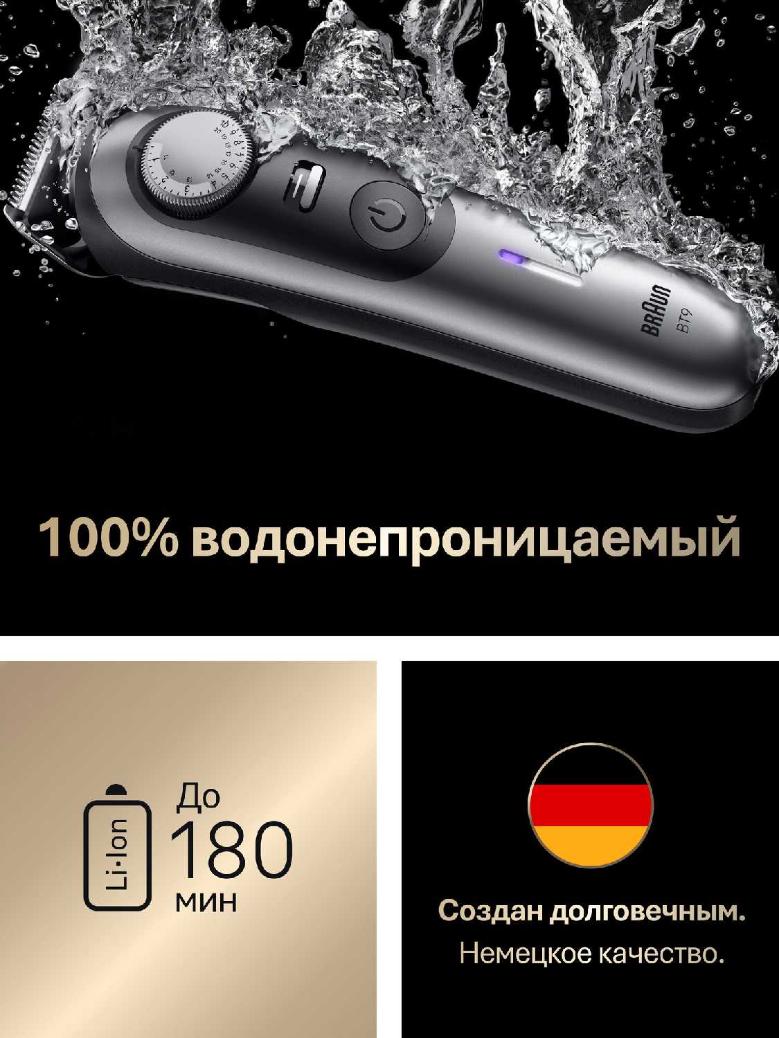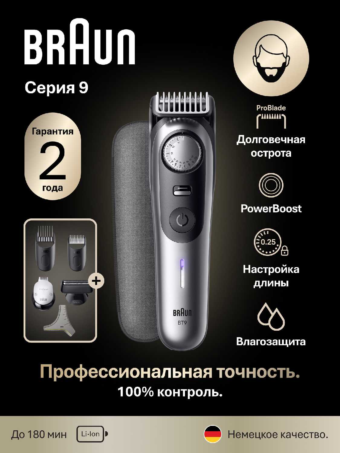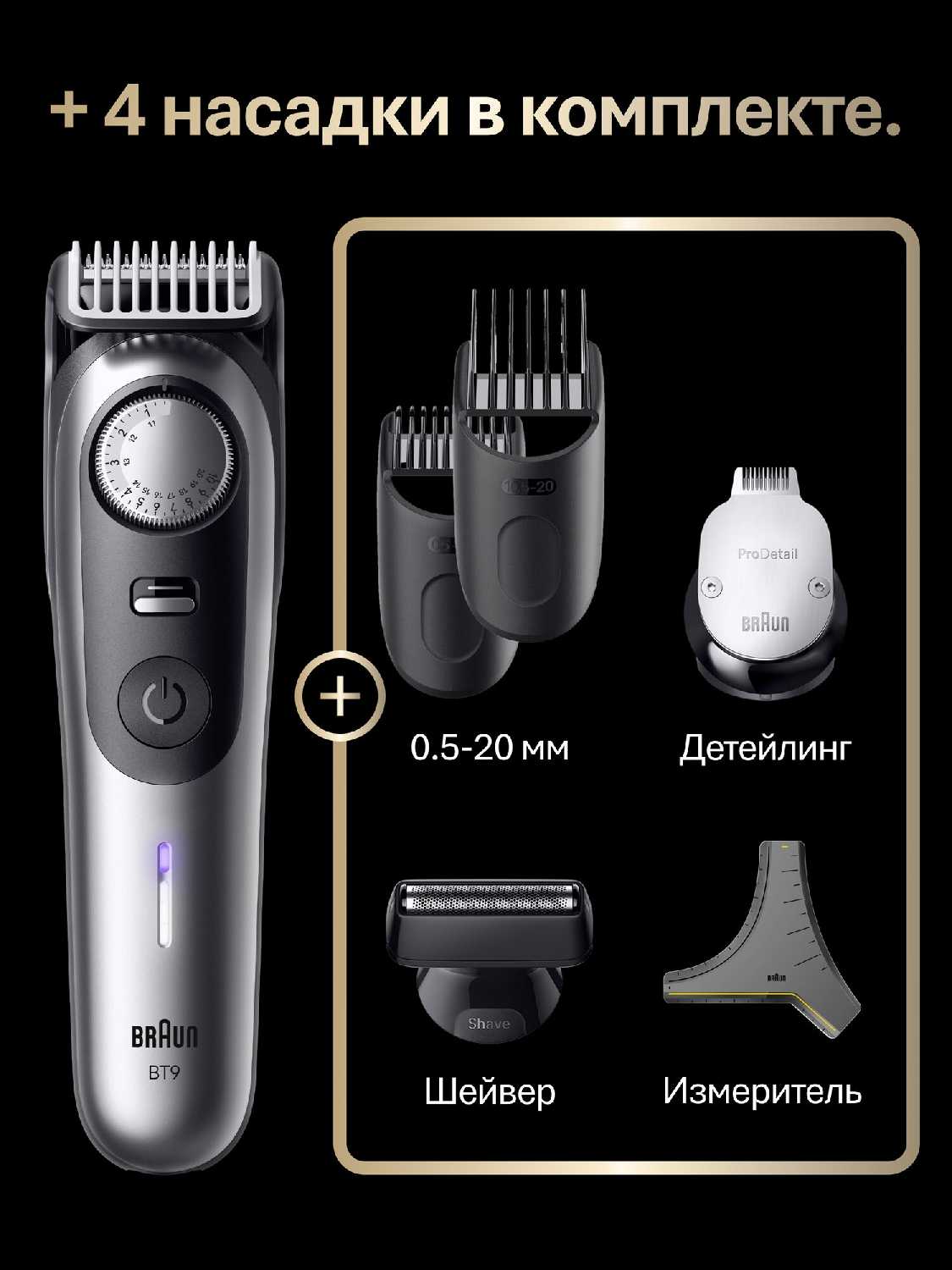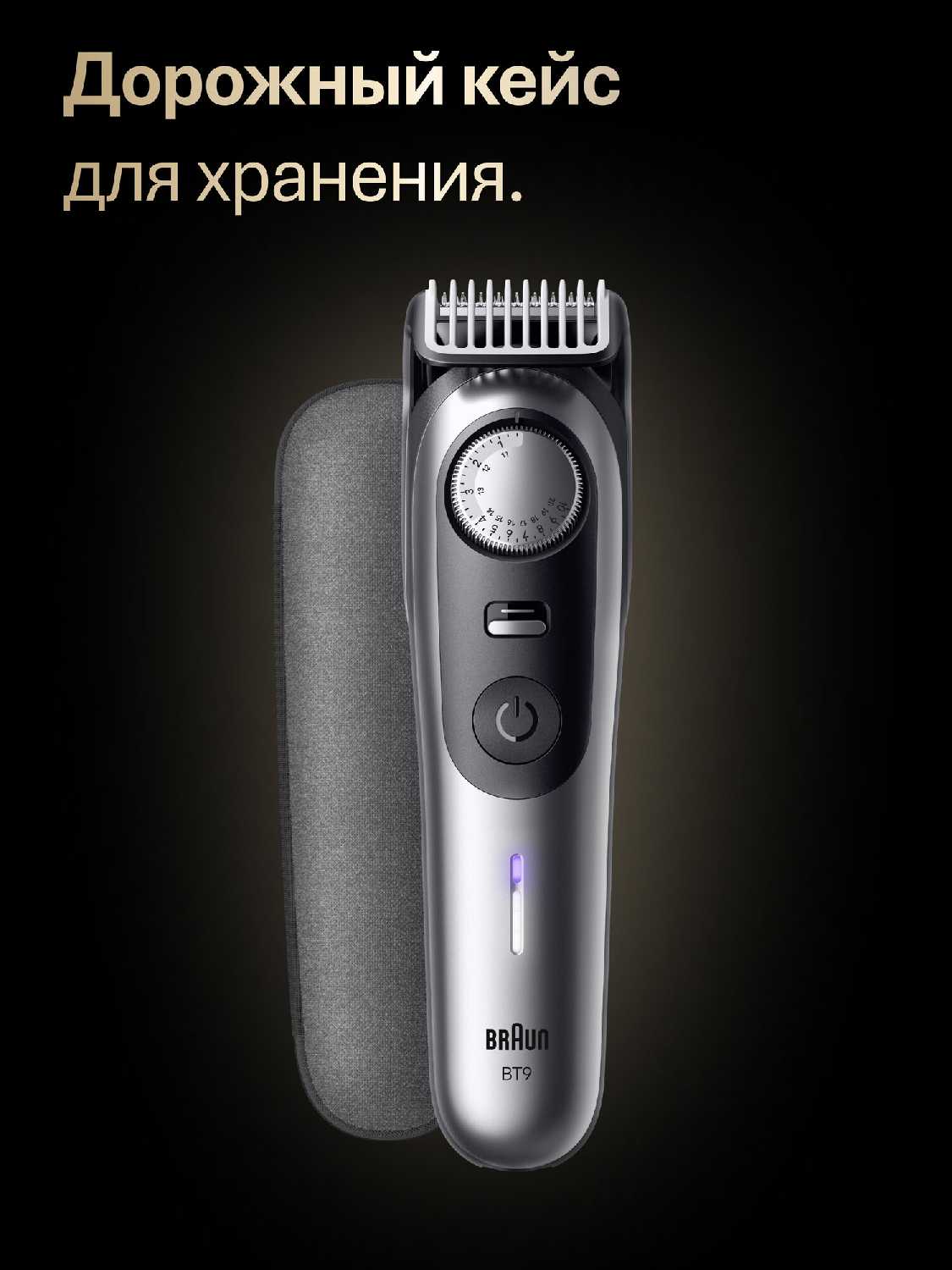 | Дополнительная информация : | подробная комплектация: 1 x триммер для бороды и усов Braun bt9520, 1 x гребень для коротких волос (05-10 мм), 1 x гребень для длинных волос (105-20 мм), 1 x сеточная мини-бритва, 1 x насадка для точного подравнивания, 1 x трафарет, 1 x щёточка для чистки, 1 x дорожный кейс, 1 x зарядное устройство smart plug, руководство по эксплуатации, гарантия |