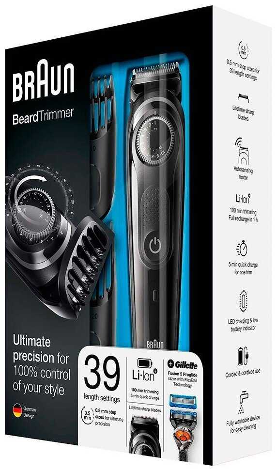 | Дополнительная информация : | в комплекте насадка-гребень для коротких волос (1-10 мм), насадка-гребень для длинных волос (10-20 мм), бритва Gillette Fusion ProGlide с технологией FlexBall, щёточка для чистки и зарядное устройство |