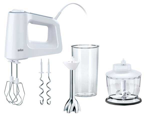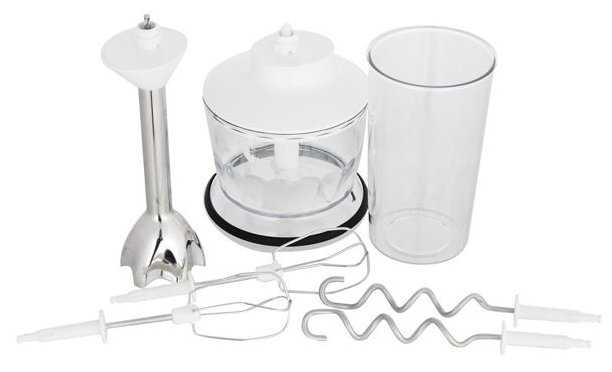 - В комплекте: венчики для взбивания, крюки для теста, погружная ножка-блендер, измельчитель с чашей, мерный стакан.