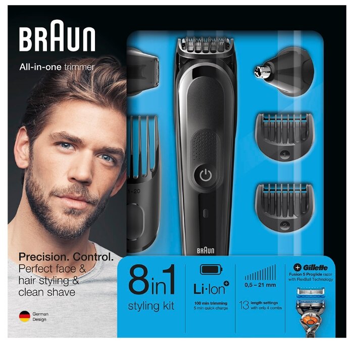 | Дополнительная информация : | насадка-гребень для коротких волос 3-11 мм, насадка-гребень для длинных волос 13-21 мм, насадка-гребень 2 мм, насадка-гребень 1 мм, насадка для точного стайлинга, насадка для носа и ушей, щеточка для чистки, бритва Gillette Fusion ProGlide, 2 кассеты |