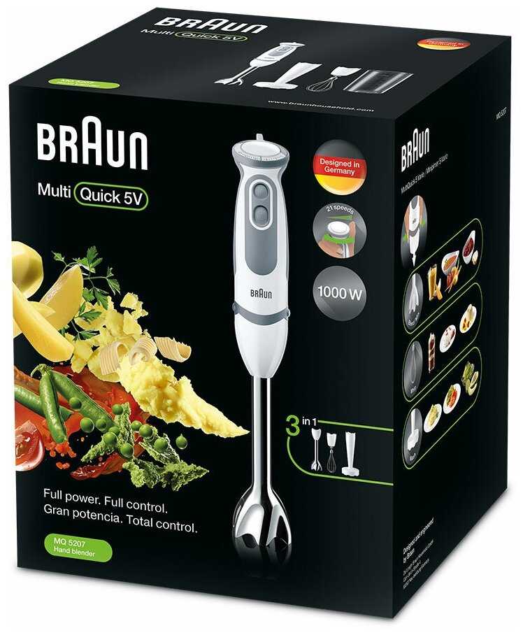 Блендер фирмы Braun использую лет 14-15. Ранее была модель как Braun 4191-MQ5245WH (на фото темно-серый), но в старом дизайне. Данная модель служит до сих пор, но последний год не работает переключение скоростей, работает на турбо скорости (но 14 лет это всё таки срок). Сейчас приобрела Braun 4191-MQ5207WH. Часть с мотором - это модель как и раньше 4191, поэтому подходит к моим старым чашам. Это удобно. Различие в прилагаемых насадках и емкостях. Все мои насадки и чаши от старого блендера в порядке, поэтому выбрала набор с насадкой для картофельного пюре. Корпус блендера прорезиненный, в руке не скользит. Это важно, потому что руки при готовке часто влажные. Переключение скоростей теперь немного другое, деления устойчивы к стиранию, закрыты прозрачным пластиком. Венчик я использую не часто. У него тонкие струны, мне удобно взбивать только воду или молоко с сахаром и яйцами. Но можно и не доставать венчик, а все делать основной насадкой. Основная насадка это металлический измельчитель с металлическим ножом. Его можно использовать как измельчитель, и для взбивания чего-либо. Измельчать можно и холодные, и горячие блюда. Если суп-пюре измельчить горячим, то он становится очень нежным. Для приготовления детского питания такой измельчитель незаменим. Пластиковый стакан с делениями до 600 мл. В нем приспособилась делать коктейли. Молоко + банан, молоко + замороженные фрукты. Со всем металлический нож справляется. В старом наборе для коктейлей использовала большой измельчитель, тоже справлялся замечательно. В набор 4191-MQ5207WH входит насадка для картофельного пюре. Вот именно из-за нее мой выбор пал на данную модель. Картофельное пюре делаю часто. Насадка позволяет сделать нежное пюре без усилий. Сама насадка полностью пластиковая с большим пластиковым ножом. Я довольно давно пользуюсь этим блендером нареканий нет.