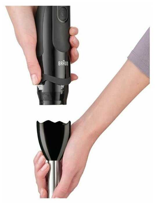 - Защита от брызг на погружной насадке предотвращает разбрызгивание, делая процесс приготовления чистым.