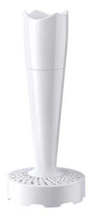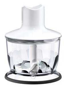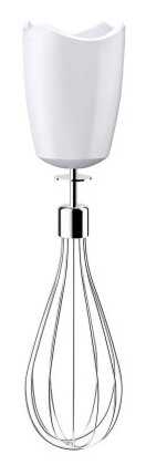 - Включает погружную ногу, венчик, измельчитель с чашей 0,5 л, насадку для пюре и стакан, что позволяет готовить смузи, фарш, супы-пюре и взбивать тесто.