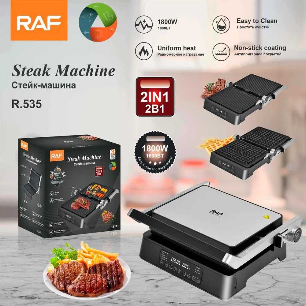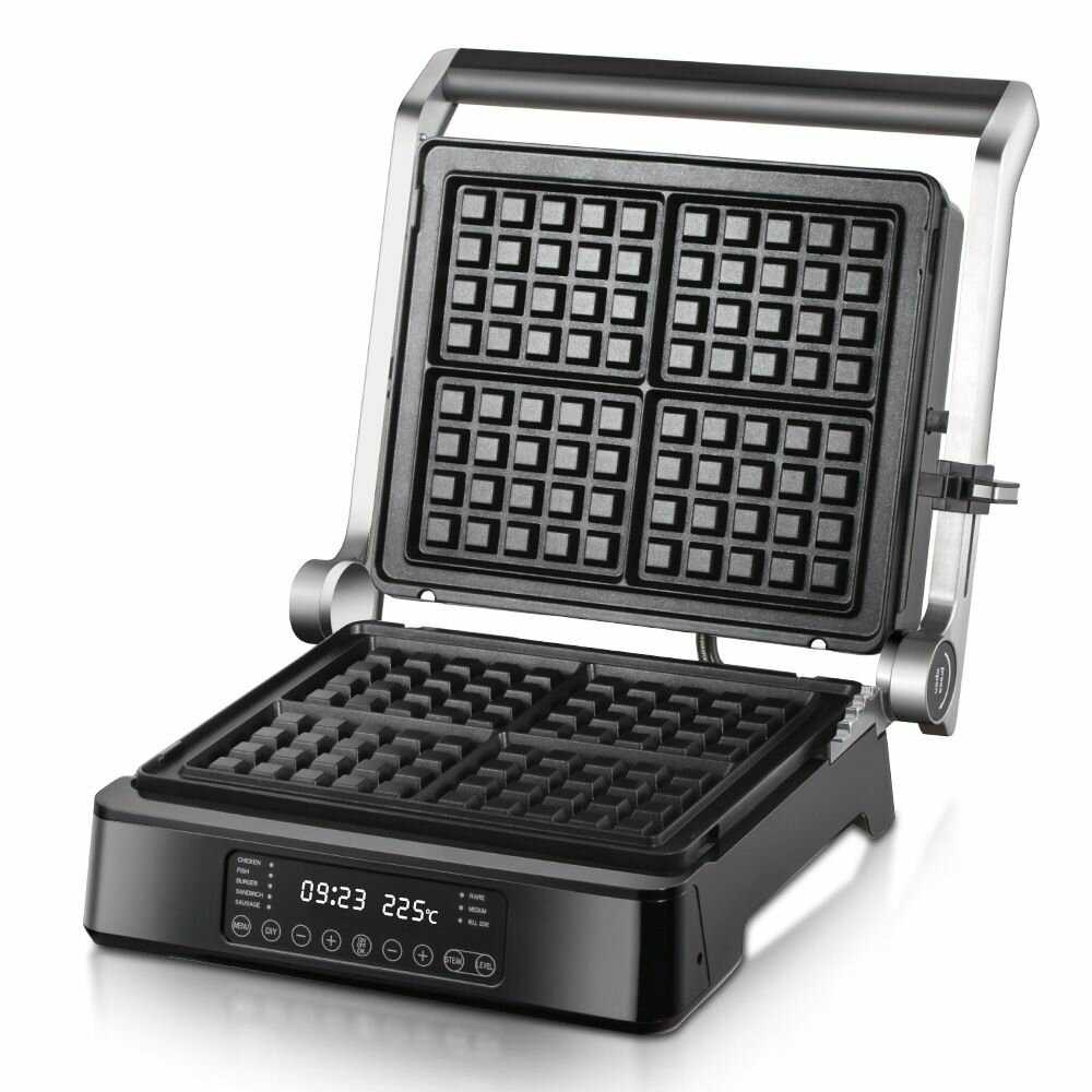 - Сменные панели (вафельная, плоская, рифлёная) позволяют готовить стейки, овощи, вафли и блины.