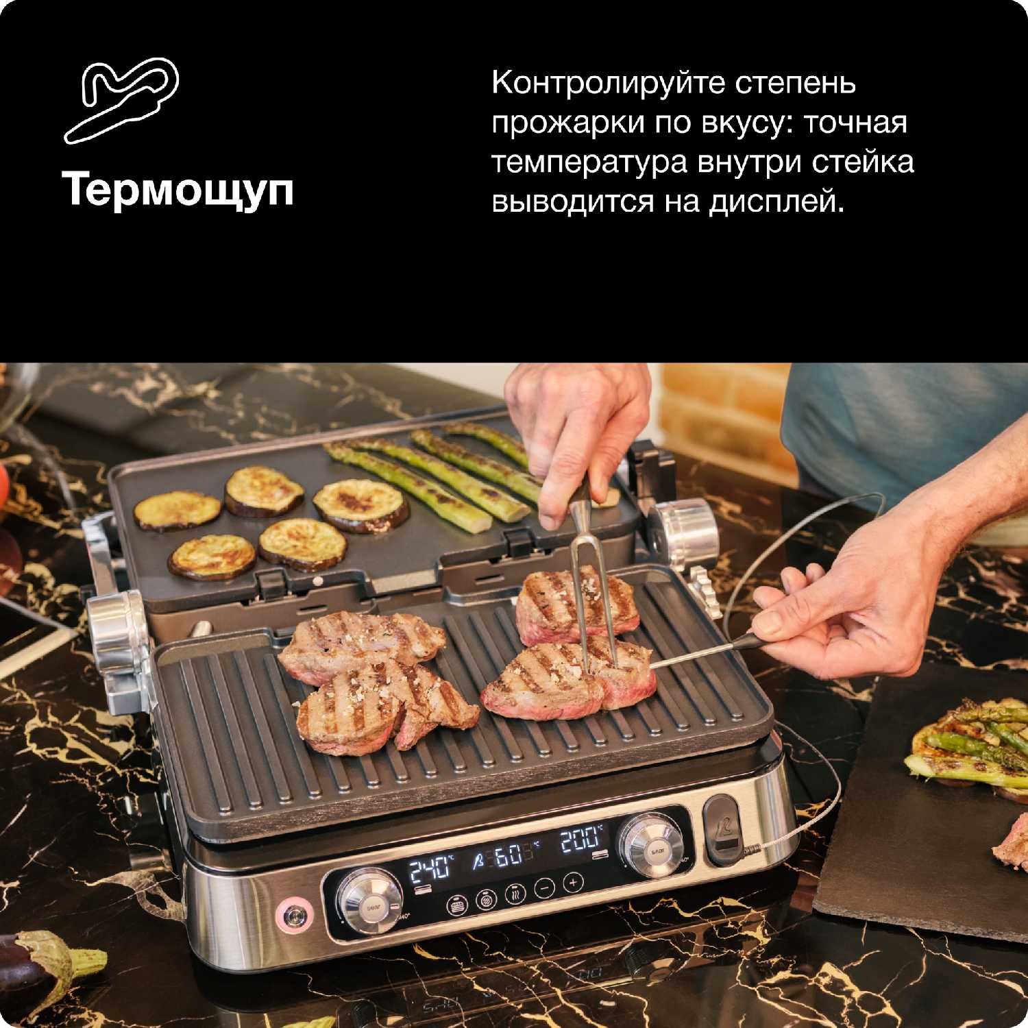 - Термощуп обеспечивает контроль прожарки мяса с точностью до 1-2°C.