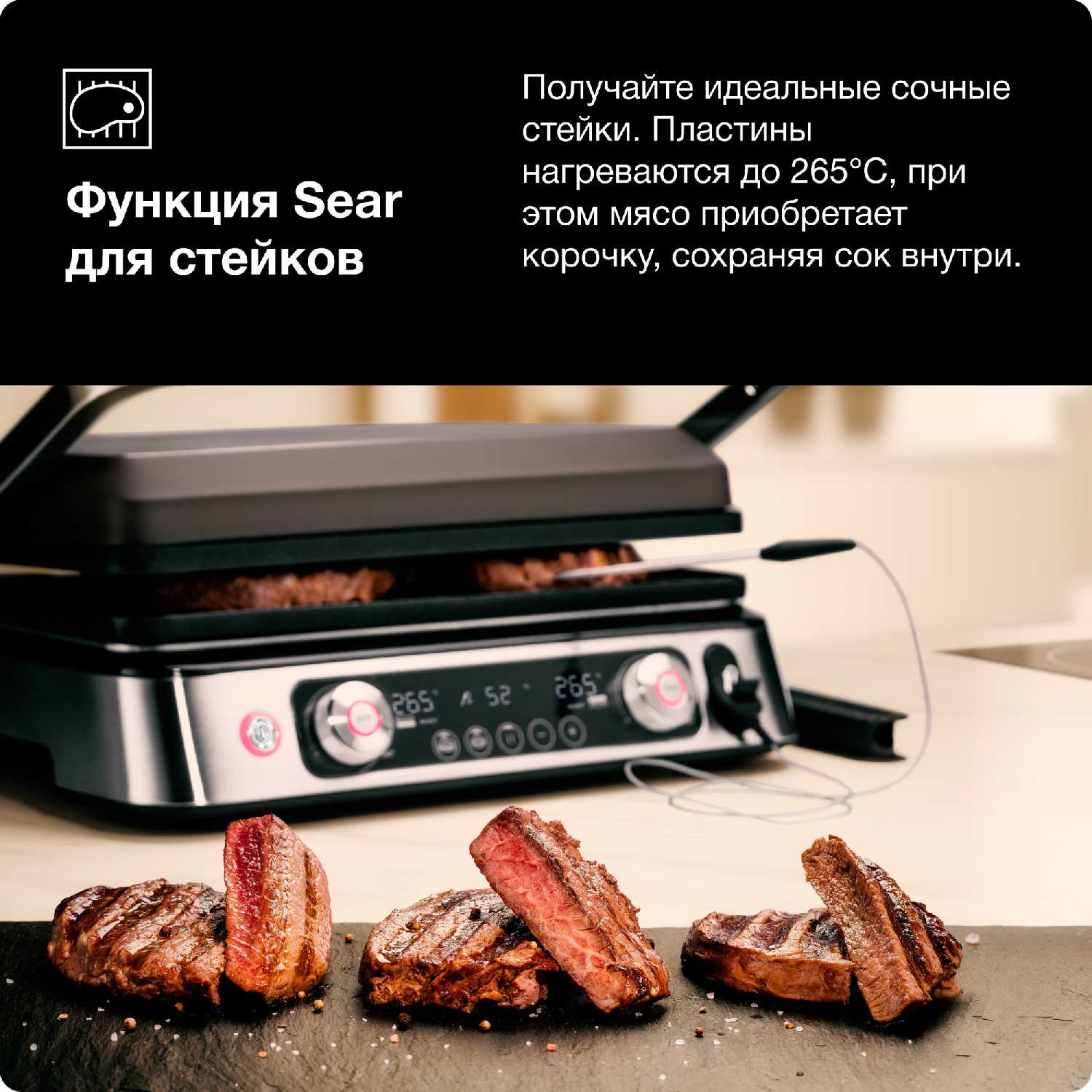 - Стейки и куриная грудка прожариваются идеально сочно за 3-8 минут без пересыхания.