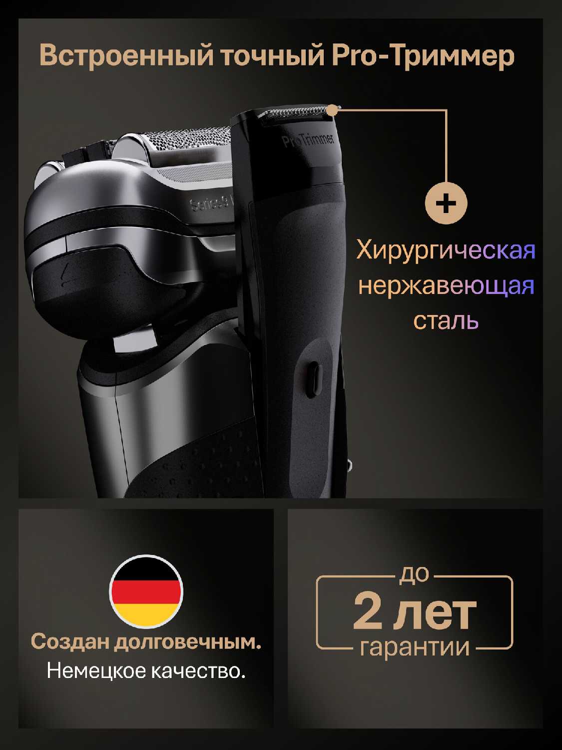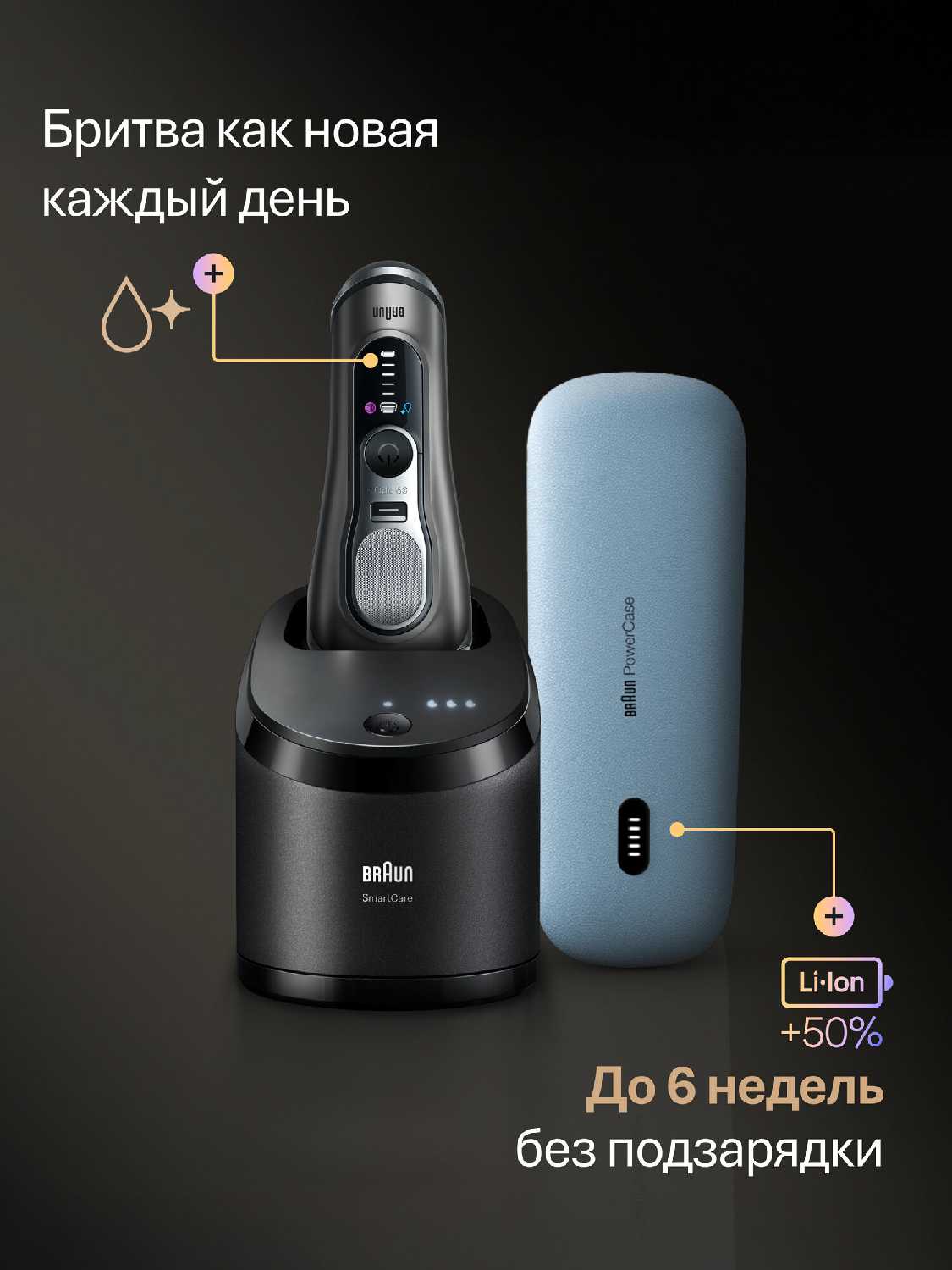 - + Премиальный инструмент для идеального бритья. Обеспечивает гладкое бритьё без раздражения, подходит для влажного и сухого использования. В комплекте — станция очистки, зарядный чехол и триммер.