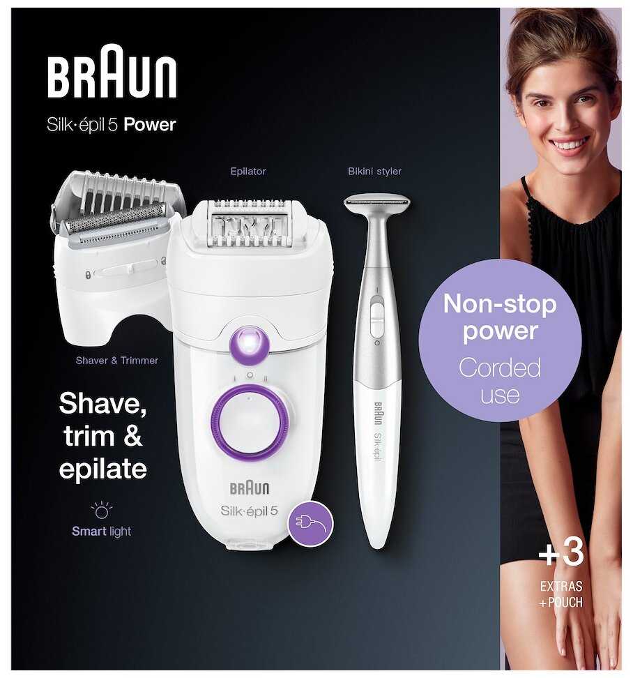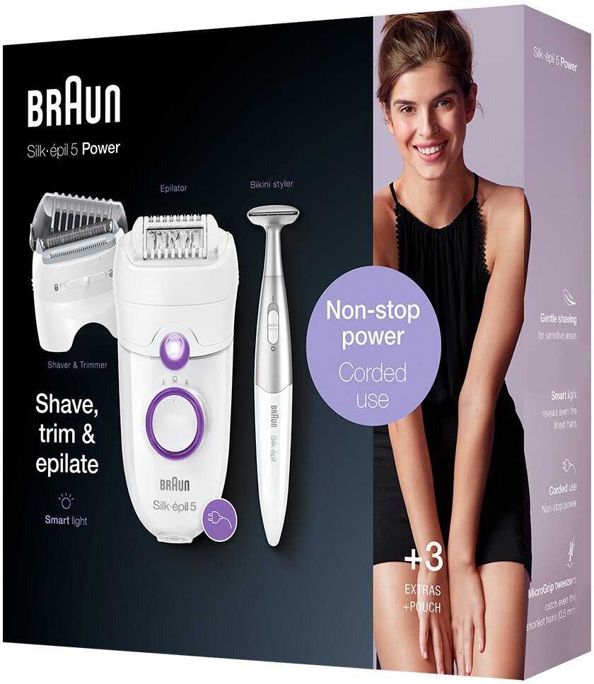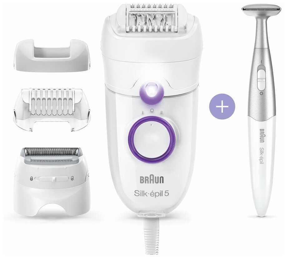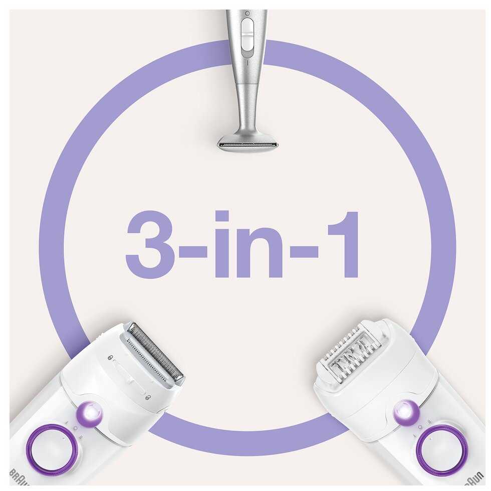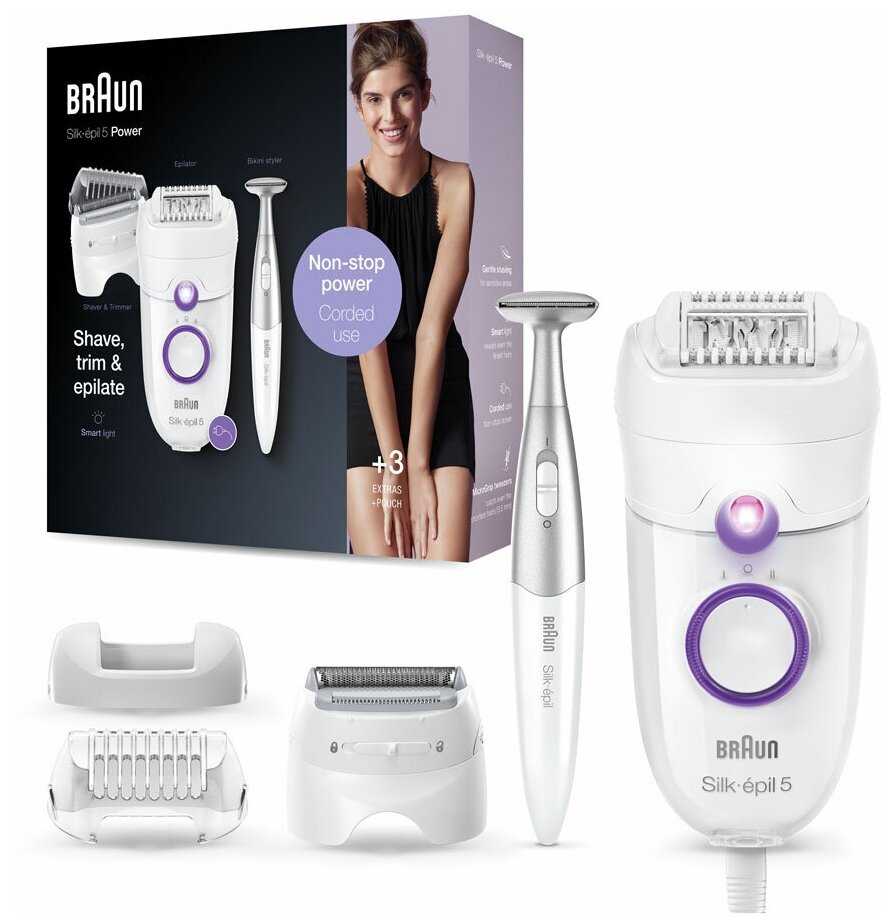 Насадка для более близкого контакта с кожей, Бритвенная насадка, Насадка-триммер, Стайлер для линии бикини, Щёточка для чистки, Кабель питания, Косметичка, Эпилятор