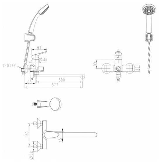 | Комплектация : | держатель лейки, лейка, ручной душ, смеситель, шланг, эксцентрик |