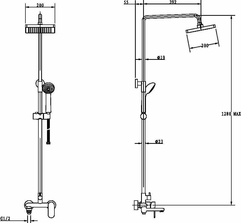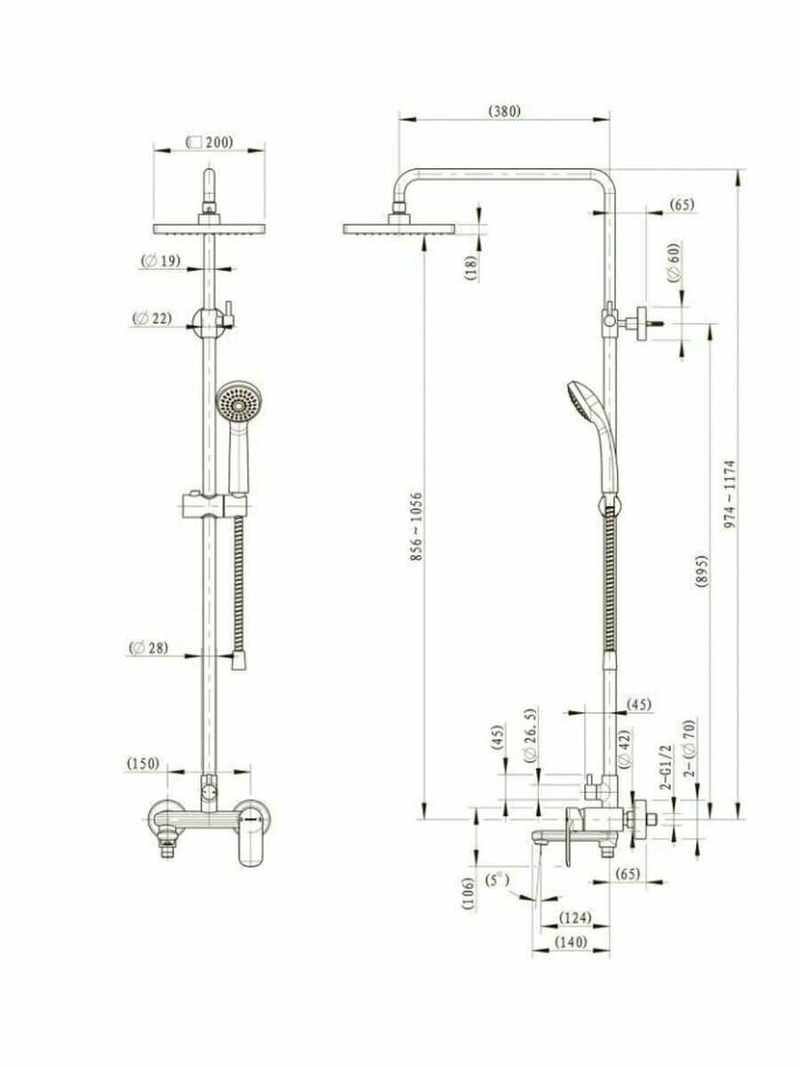 высота стойки для душа: 1174 мм, длина верхнего душа: 200 мм, ширина верхнего душа: 200 мм, диаметр ручного душа: 80 мм