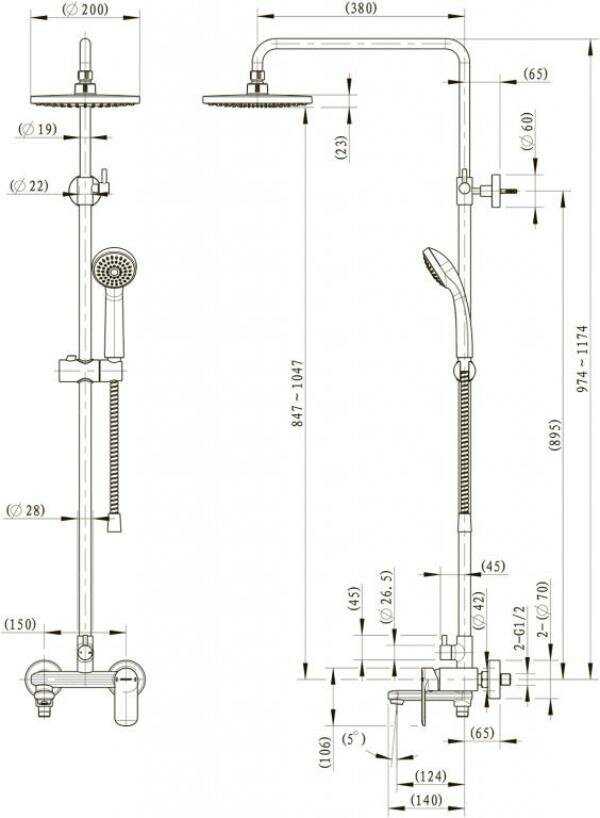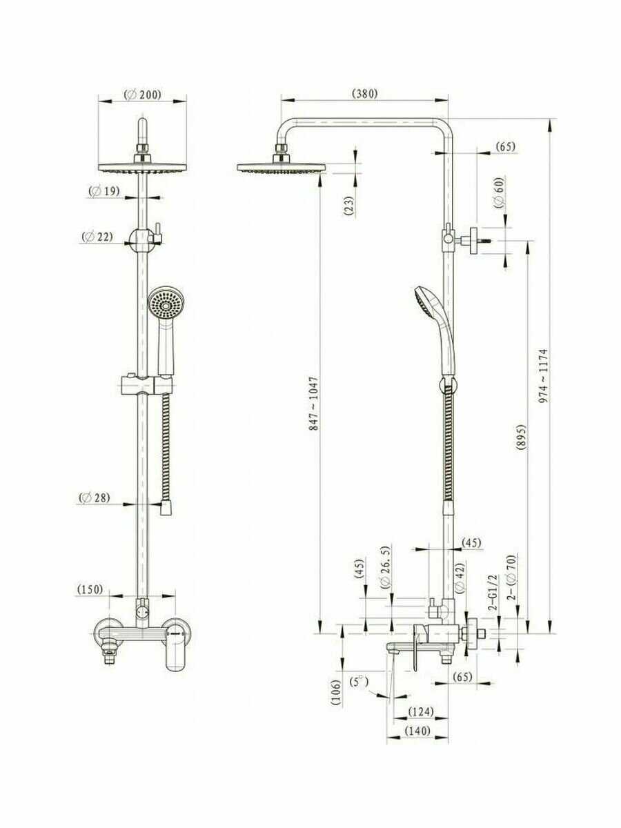 высота стойки для душа: 1174 мм, диаметр душевой лейки: 80 мм, диаметр верхнего душа: 200 мм